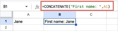 = CONCATENATE(“First name: “,A1)