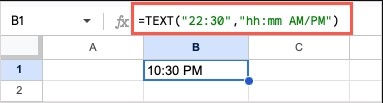 =TEXT(“22:30”,” hh:mm AM/PM”)