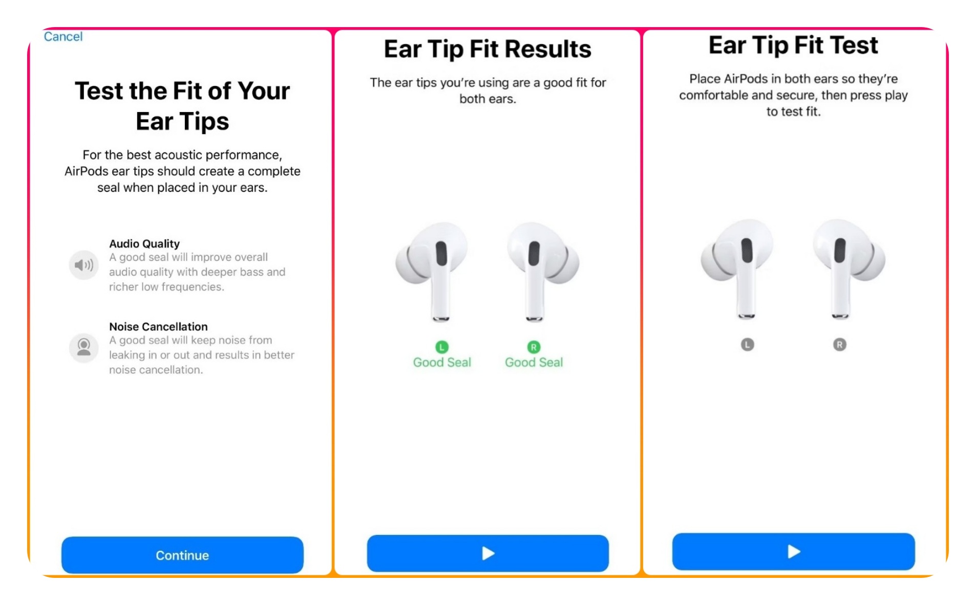 Apple은 귀하의 기기에 소프트웨어 기반 이어팁 착용 테스트를 제공합니다. 이를 통해 소리가 귀 안팎으로 새는 것을 가장 잘 방지할 수 있는 이어팁 크기를 알 수 있습니다.