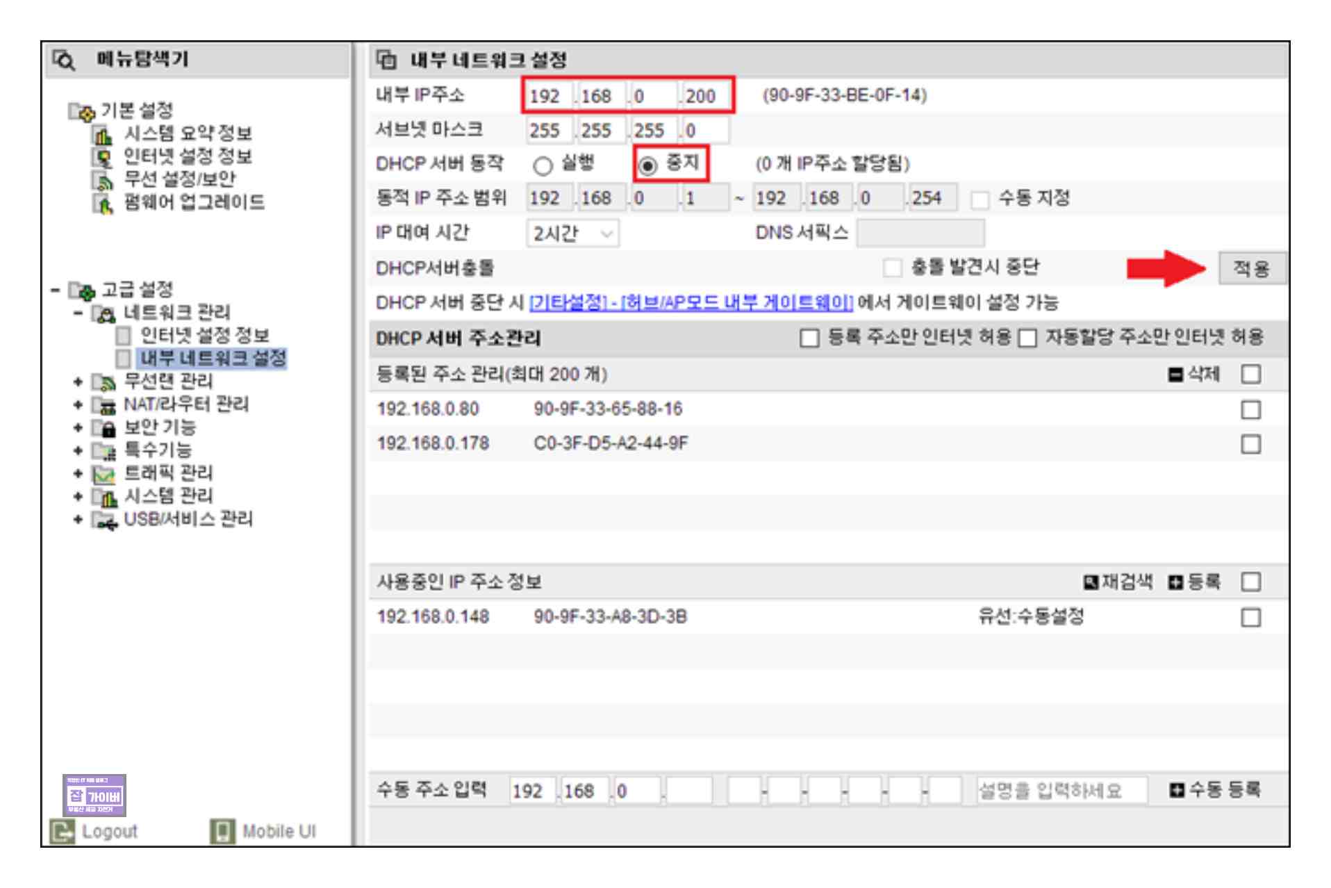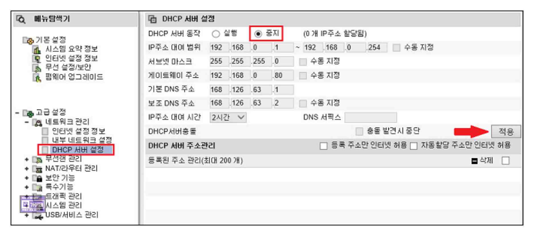 이를 위해 [DHCP 서버 동작]을 [중지]로 체크 후 [적용]을 클릭합니다.