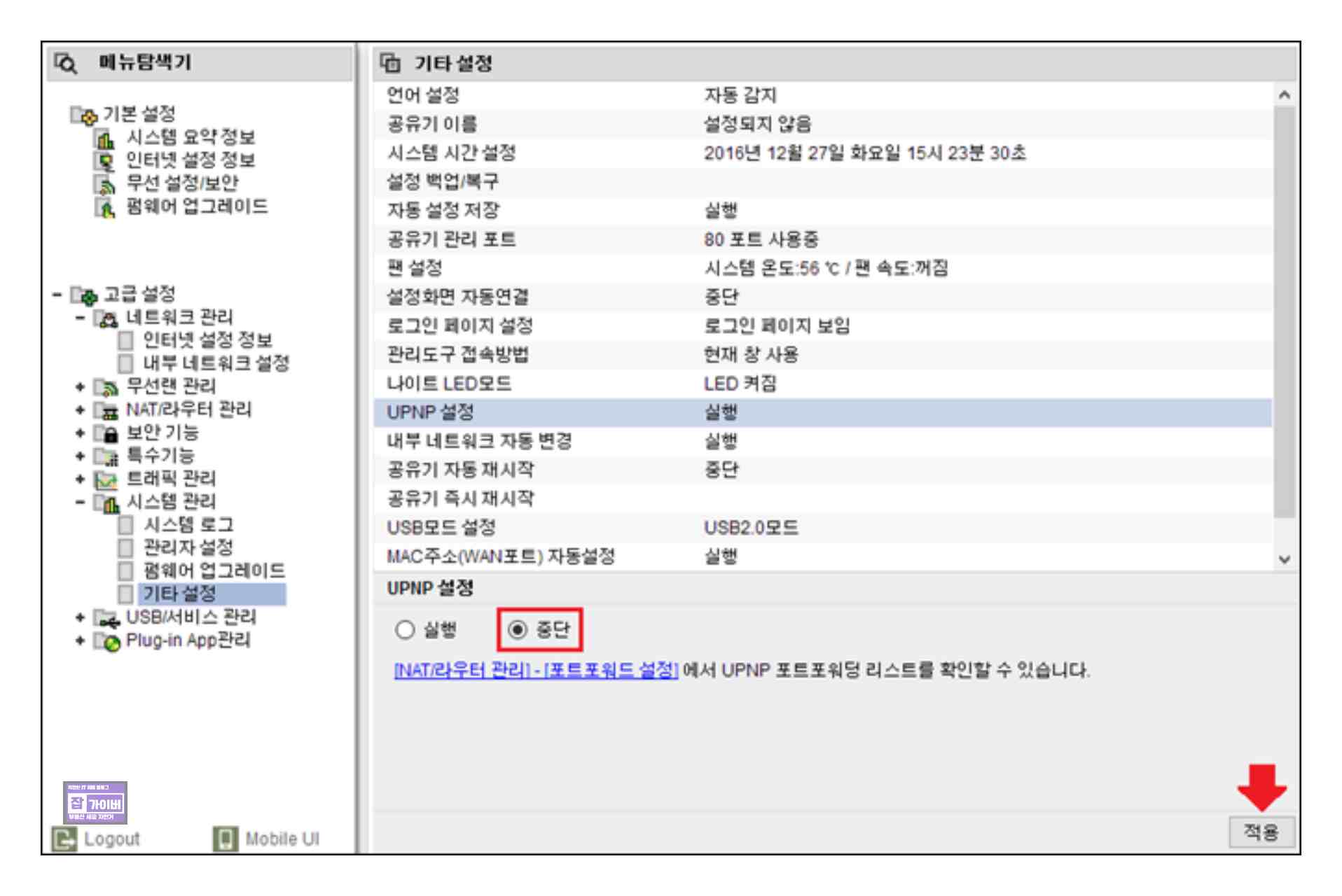 둘째, 일부 환경에서 공유기를 스위치(허브)로 변경 후, UPNP 포트포워딩 기능이 실행 중이라면 네트워크 장애를 유발시킬 수 있으므로 해당 기능을 중단해야 합니다.