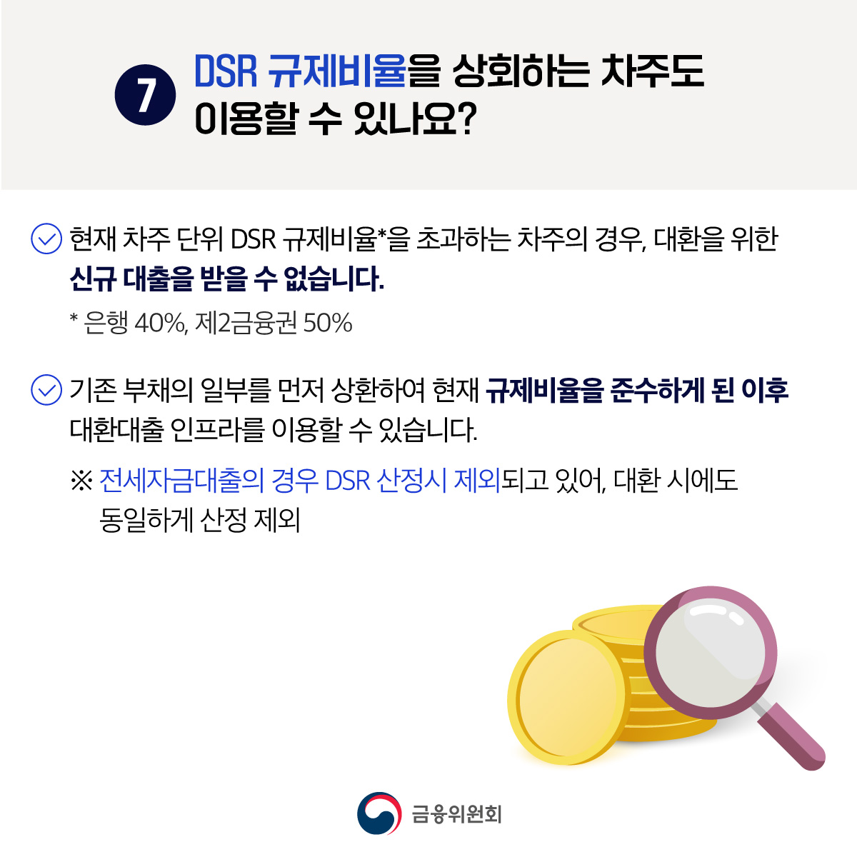 · 현재 차주 단위 DSR 규제비율*을 초과하는 차주의 경우, 대환을 위한 신규 대출을 받을 수 없습니다.