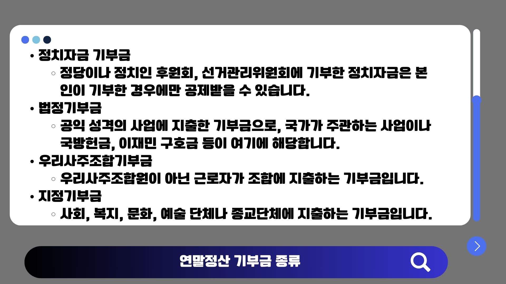 연말정산에서 고려해야 할 기부금의 종류는 다음과 같습니다: