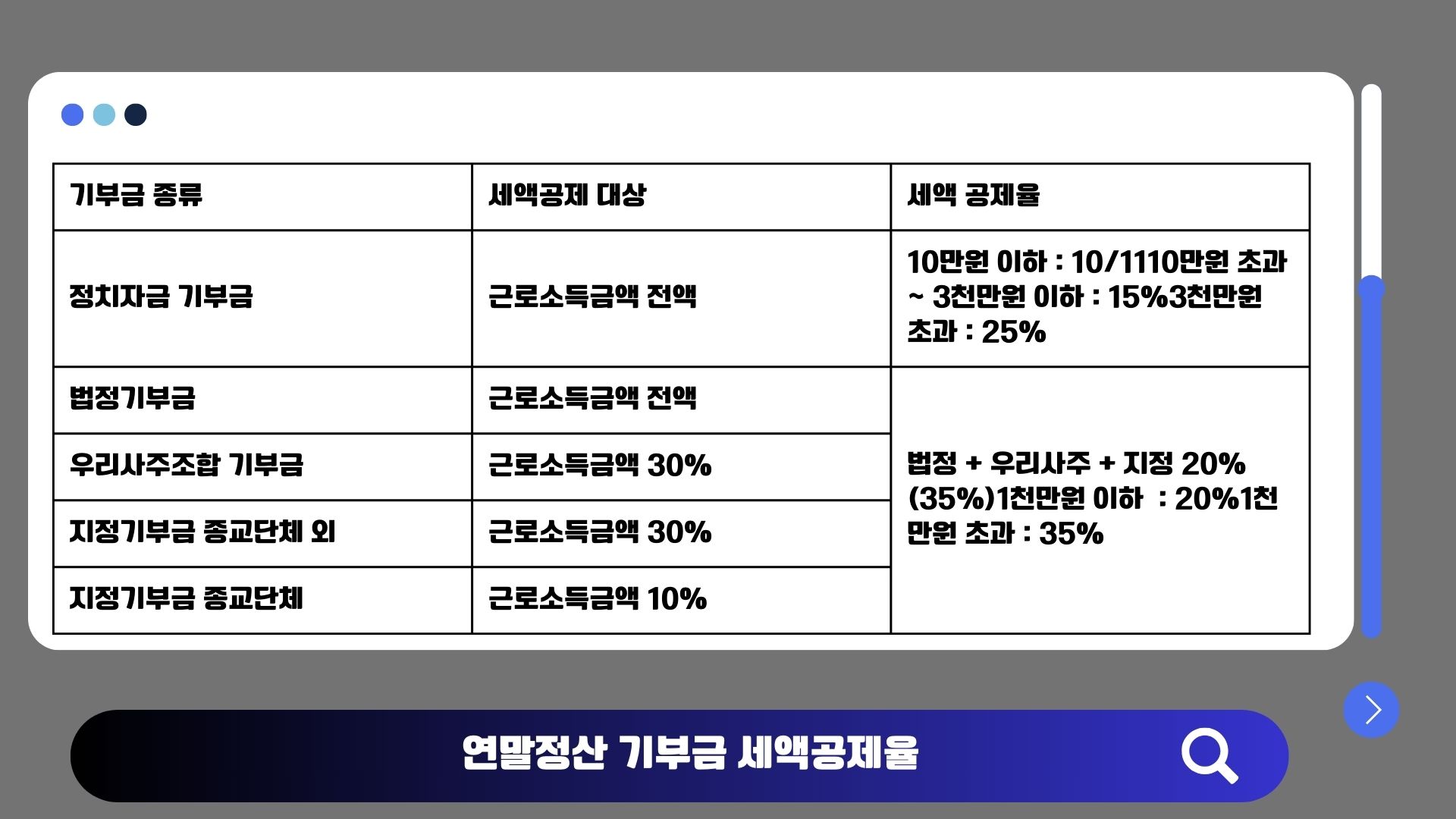 정치자금 기부금: 10만 원 이하는 100/110의 공제율을, 10만 원 초과는 15%, 3천만 원 초과는 25%의 공제율이 적용됩니다.