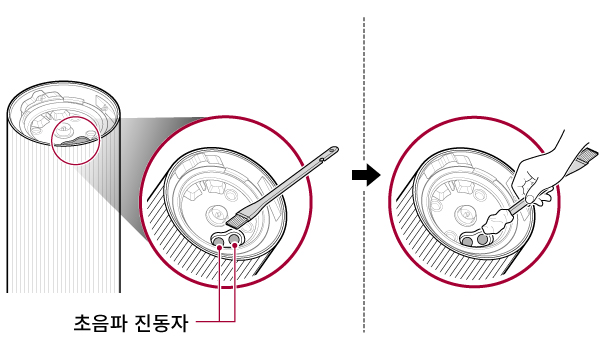 초음파 진동 방식 가습기는 이 진동단자 부분이 막혀있을 경우 제대로 연기가 나오지 않게 되므로, 이 부분의 청결 상태를 점검해보시길 바랍니다. 특히 보틀 가습기나 '촉촉300'과 같은 제품의 경우, 분무가 되는 윗쪽을 면봉으로 깨끗이 닦아주면 가습기 기능이 원활히 작동하게 됩니다.