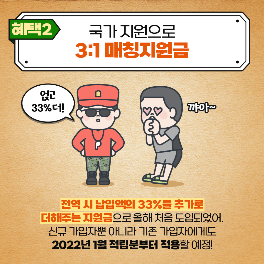 군인들이 전역 이후 학교로 돌아가거나 사회에 첫발을 내딛는 청년들인데, 월급을 인상하고, 인상된 월급을 허투로 쓰지 않게 장병내일준비적금을 통해 정부 지원금을 보태줘서 청년들이 좀 더 여유롭게 새로운 출발을 준비, 시작할 수 있도록 도와주는 좋은 정책이라고 생각합니다.