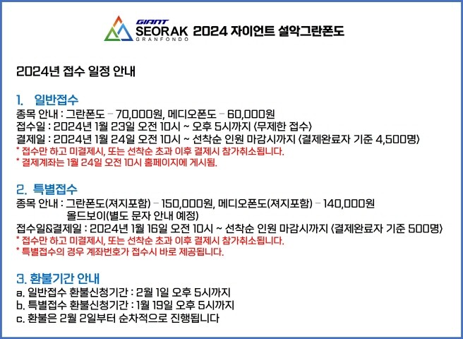 2024년 1월 23일 오전 10시부터 시작되는 일반 접수는 오후 5시까지 무제한으로 진행되며, 결제는 선착순 마감시까지 가능합니다. 특별접수는 2024년 1월 16일 오전 10시부터 시작되어 선착순 500명에 한해 진행되며, 저지가 포함된 종목은 그란폰도와 메디오폰도 각각 150,000원과 140,000원입니다.