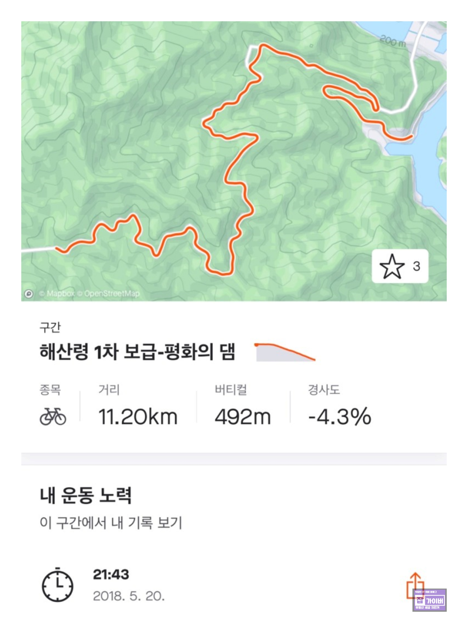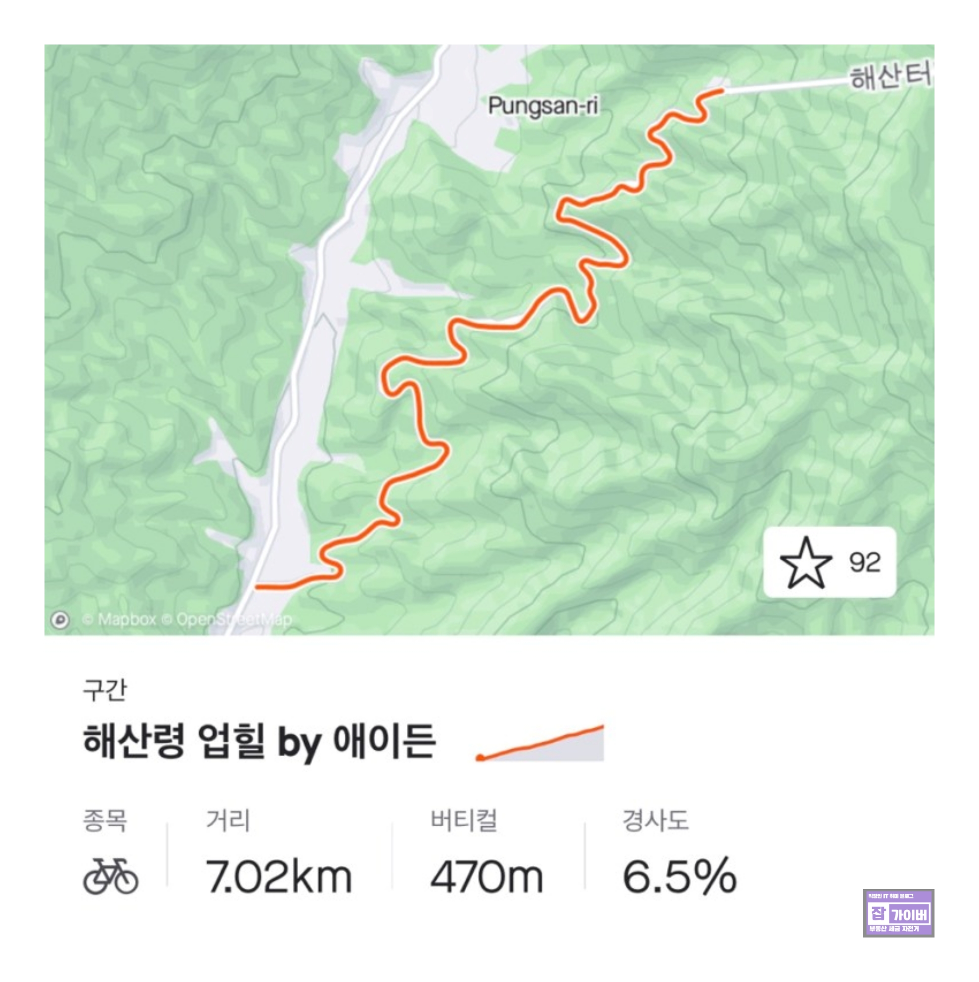 해산령 정상 - 해산령 다운힐: 이 구간은 다운힐이 포함되어 있으므로, 자전거를 잘 조하며 속도를 유지하는 것이 중요합니다. 체력을 너무 많이 소모하지 않도록 주의해야 합니다.