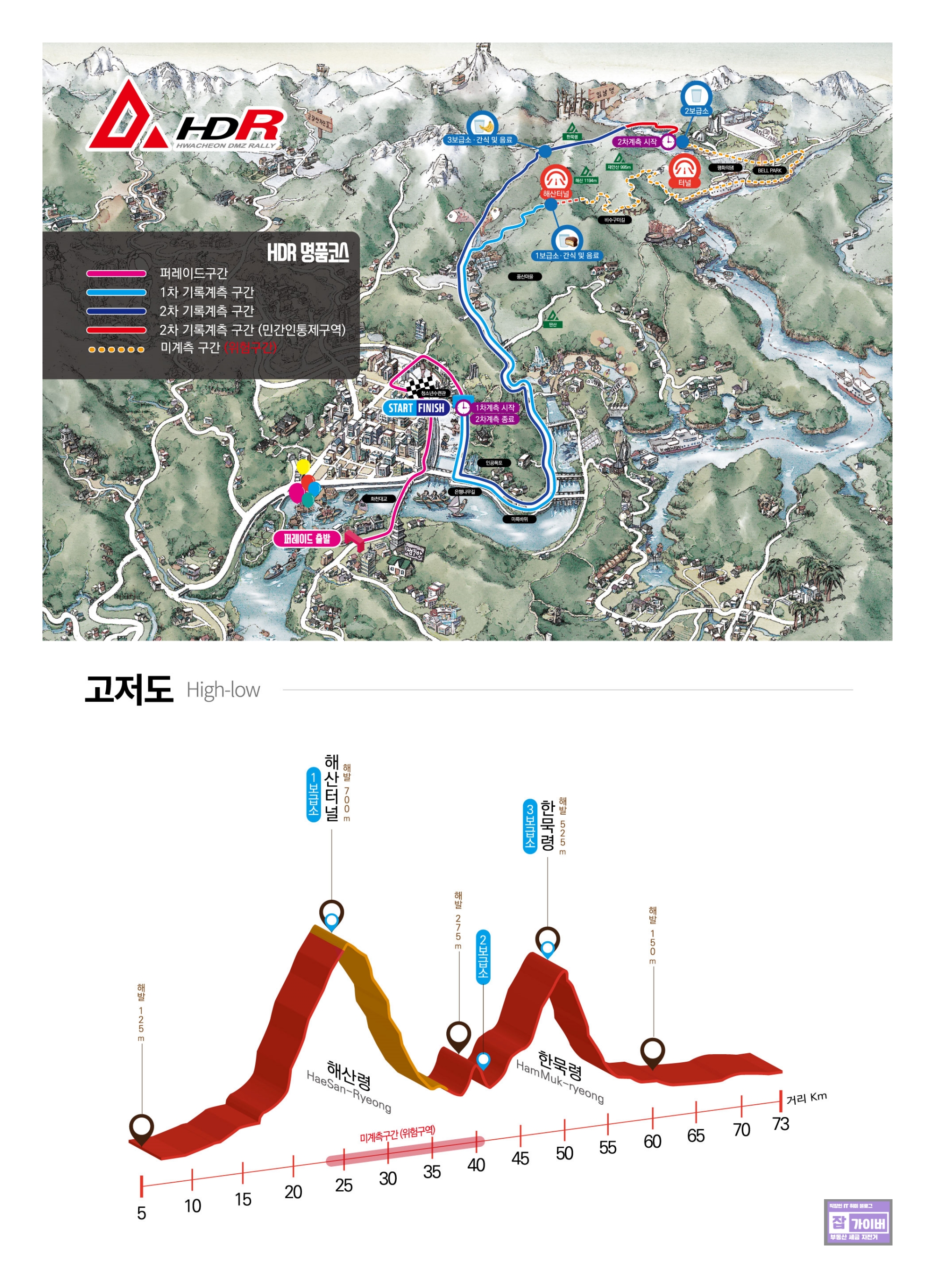 시작점 - 화천 - 해산령 정상 이 구간은 대회의 첫 시작으로, 첫 30km를 완주하는 데에 중점을 두어야 합니다. 천천히 웜업하며 체력을 소모하지 않는 것이 중요합니다.