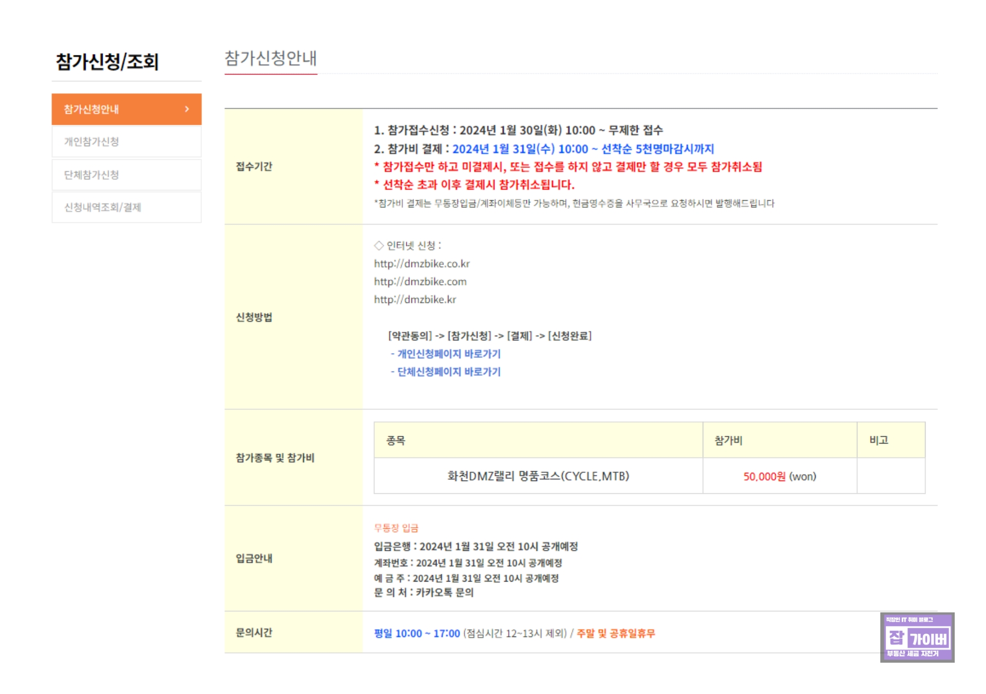 참가비에 대한 자세한 문의는 031-821-9940 번으로 가능하며, 문의를 원하시는 분들은 평일 10시부터 17시 사이, 점심시간 12시부터 13시를 제외한 시간에 연락하시면 됩니다. 주말 및 공휴일에는 문의를 받지 않으니 이 점 참고하시기 바랍니다.