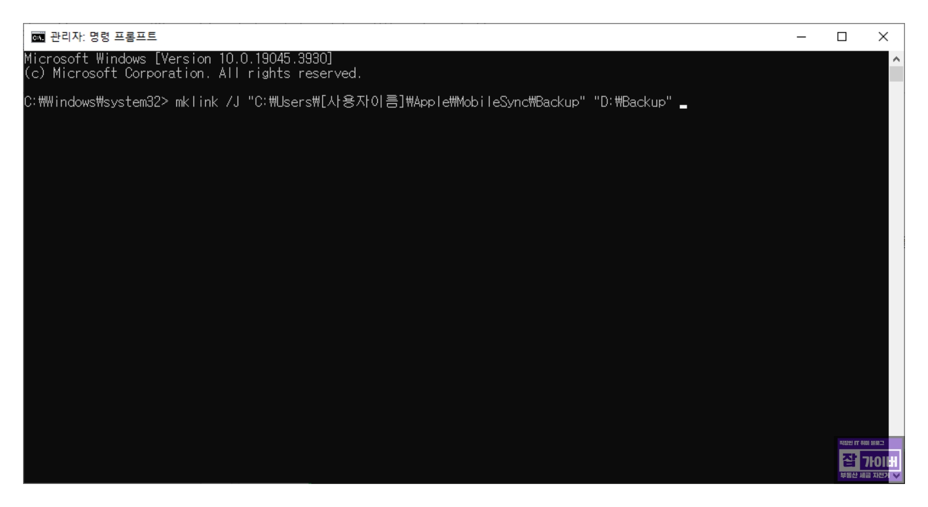 mklink /J "C:\Users\[사용자 이름]\AppData\Roaming\Apple Computer\MobileSync\Backup" "D:\Backup"