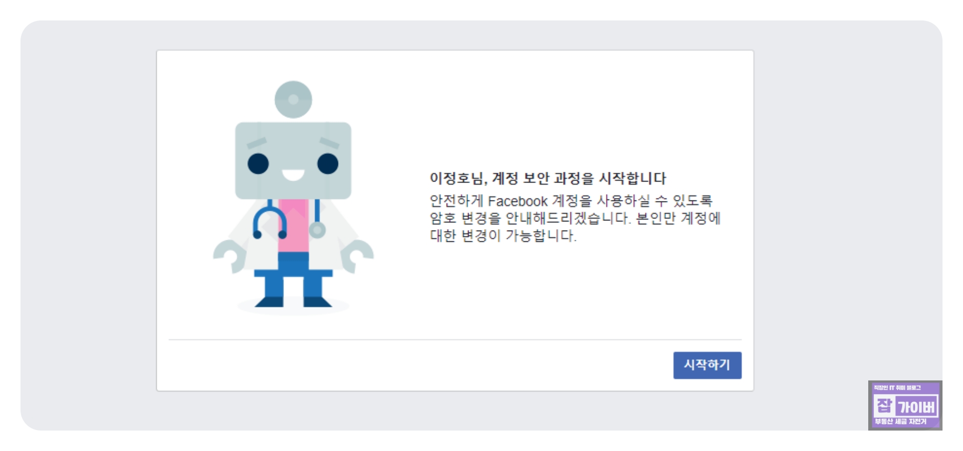 | 누군가가 회원님의 Facebook 계정에 접속한 것 같습니다. 계정을 보호하려면 다음에 Facebook에 로그인할 때 몇 가지 질문에 대답하고 비빌번호를 변경해야 합니다. 보안을 위해 완료시까지 아무도 Facebook 상에서 회원님을 볼 수 없습니다. |