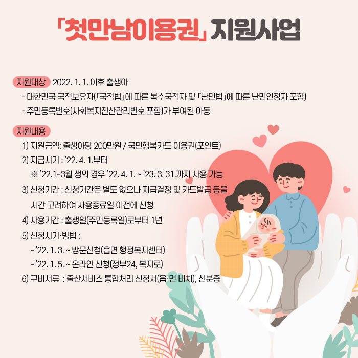첫만남이용권 신청 대상은 2022년 1월 1일 이후 출생한 가정으로, 출생신고 후 주민등록번호를 부여받아야 합니다.
