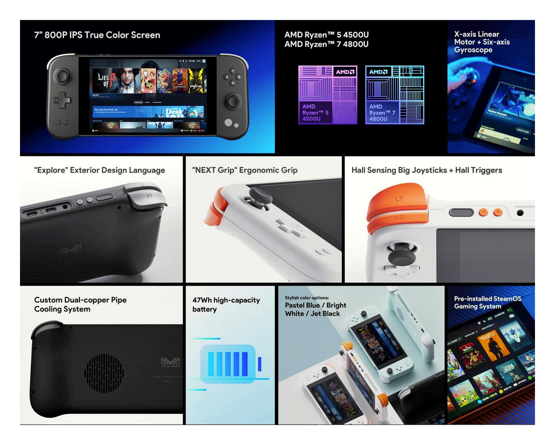 아야네오 넥스트 라이트의 디자인은 세 가지 색상으로 제공되며, 인체공학적인 설계로 편안한 그립감을 제공한다고 합니다. 화면 해상도는 7인치 800p로, 스팀 덱과 동일한 수준으로 밸브의 스팀 덱과 경쟁할 수 있는 저렴한 가격과 스팀OS의 사용으로 주목받고 있습니다.