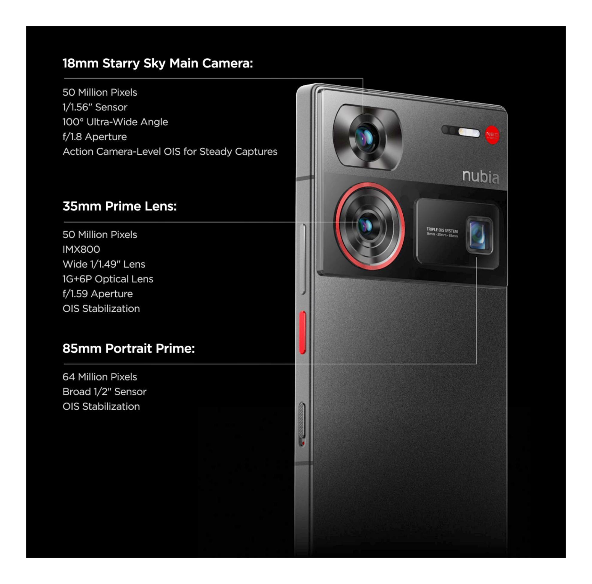 누비아 Z60 울트라의 디자인은 플랫 디스플레이 패널에 모서리마다 각을 세운 형태로, 블랙과 실버의 색상으로 제공됩니다. 빨간색으로 강조된 포인트도 눈길을 끌며, 전반적으로 세련되고 고급스러운 느낌을 줍니다. 누비아가 라이카와는 상관없이 고유한 디자인을 채택하여 차별화를 꾀했습니다.