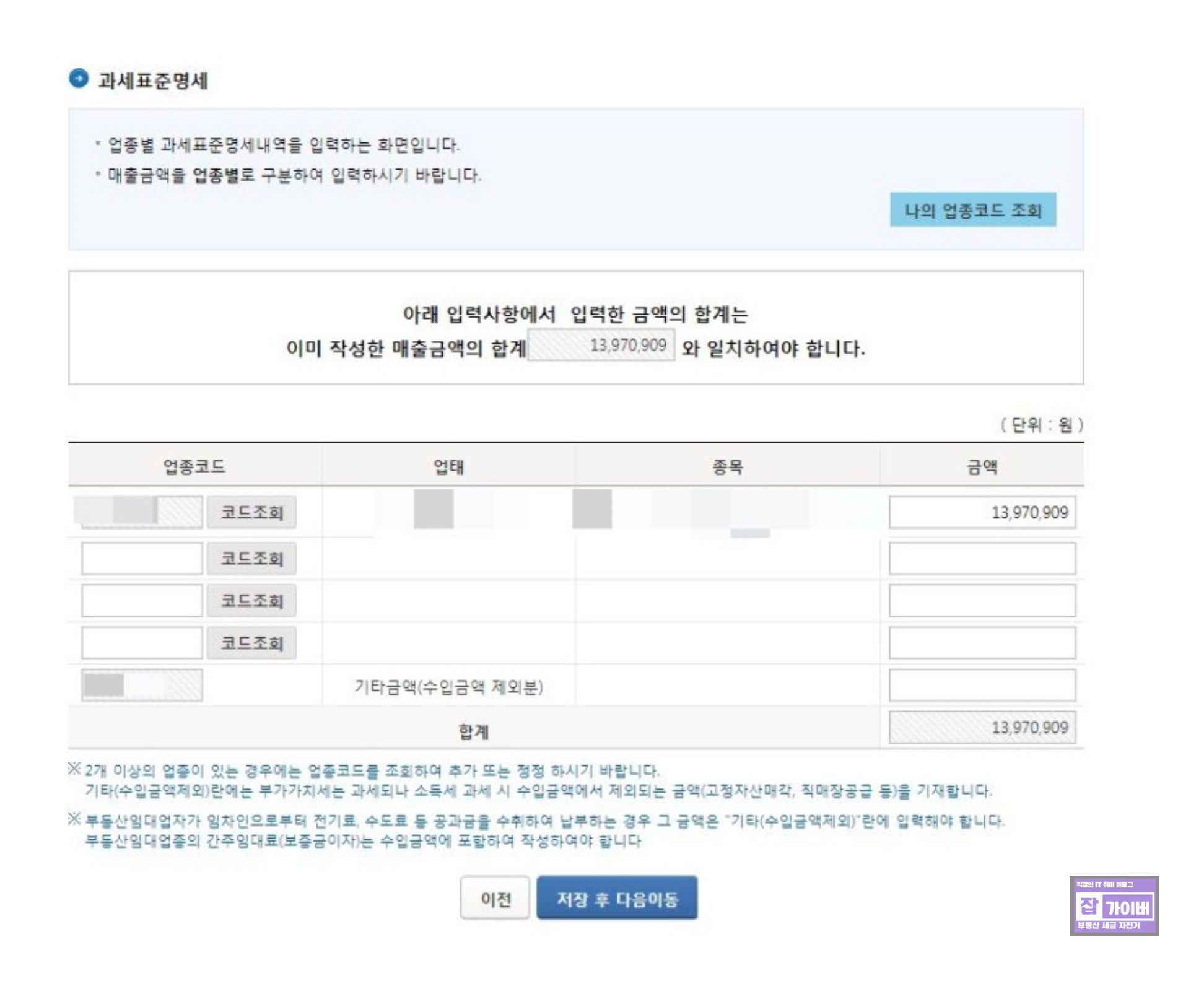 이 때 매출부분을 작성한 후에는 과세표준명세를 작성해야 하는데, 이 과정에서 몇 가지 주의해야 할 사항이 있습니다.