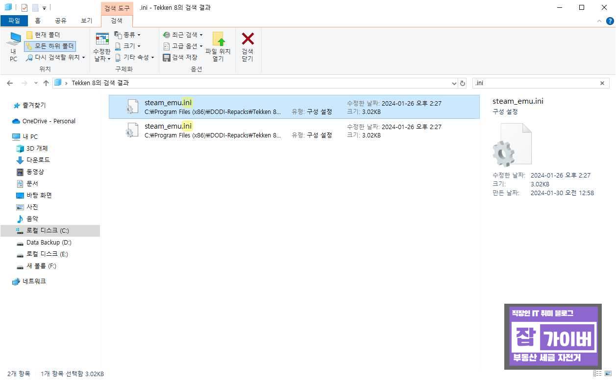 우선 철권8 설치된 폴더로 들어가 steam.emu.ini 파일을 검색하면 2개가 나옵니다.