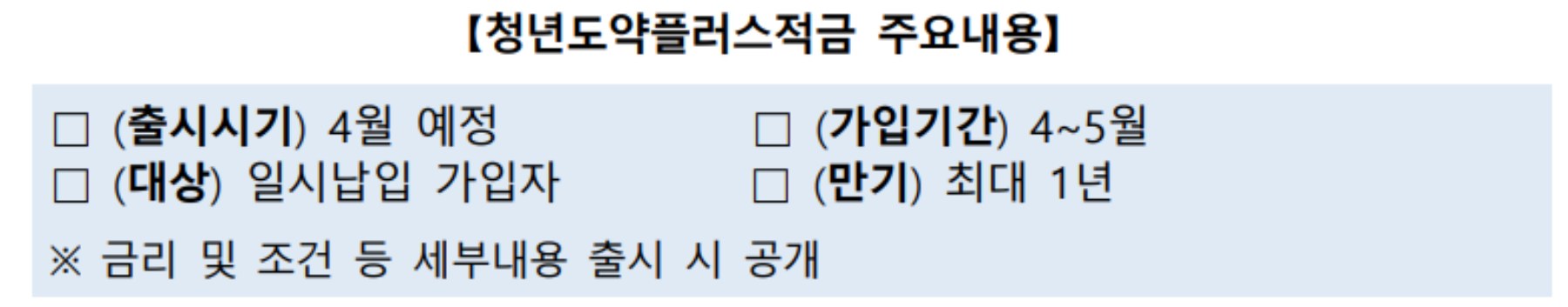 청년도약플러스적금은 청년도약계좌 일시납입 가입자를 대상으로 하며, 일반적금보다 금리가 높은 1년 만기 적금입니다.