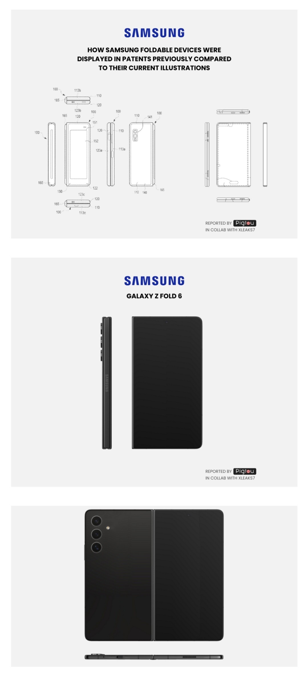 해당 렌더링은 삼성전자가 최근 출원한 특허를 기반으로 하고 있으며, 삼성의 특허에 따르면 갤럭시 Z 폴드6는 이전 모델보다 얇고 넓은 디자인을 갖추게 될 것으로 보입니다.