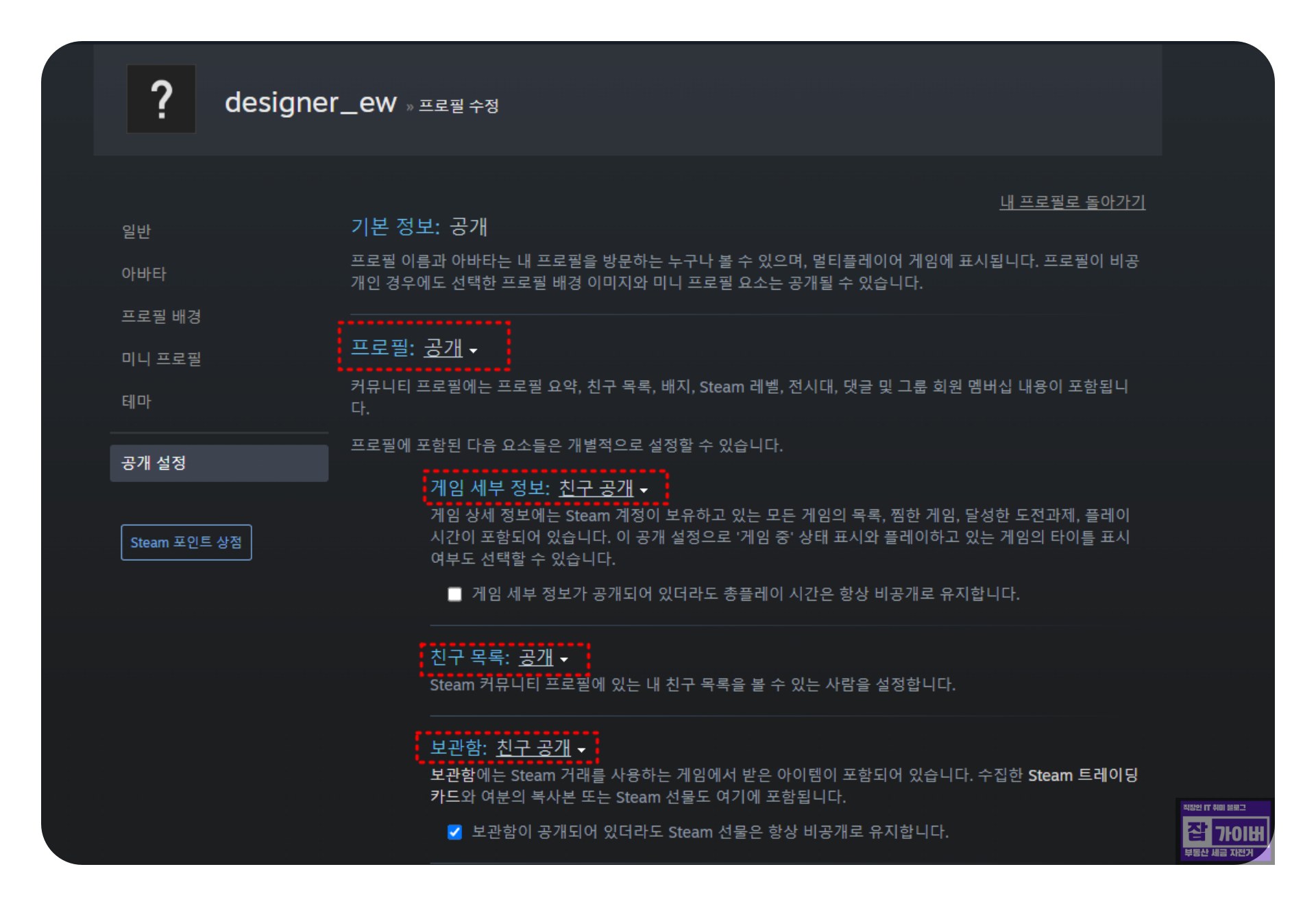 스팀계정 친구목록 비공개 숨기기 설정