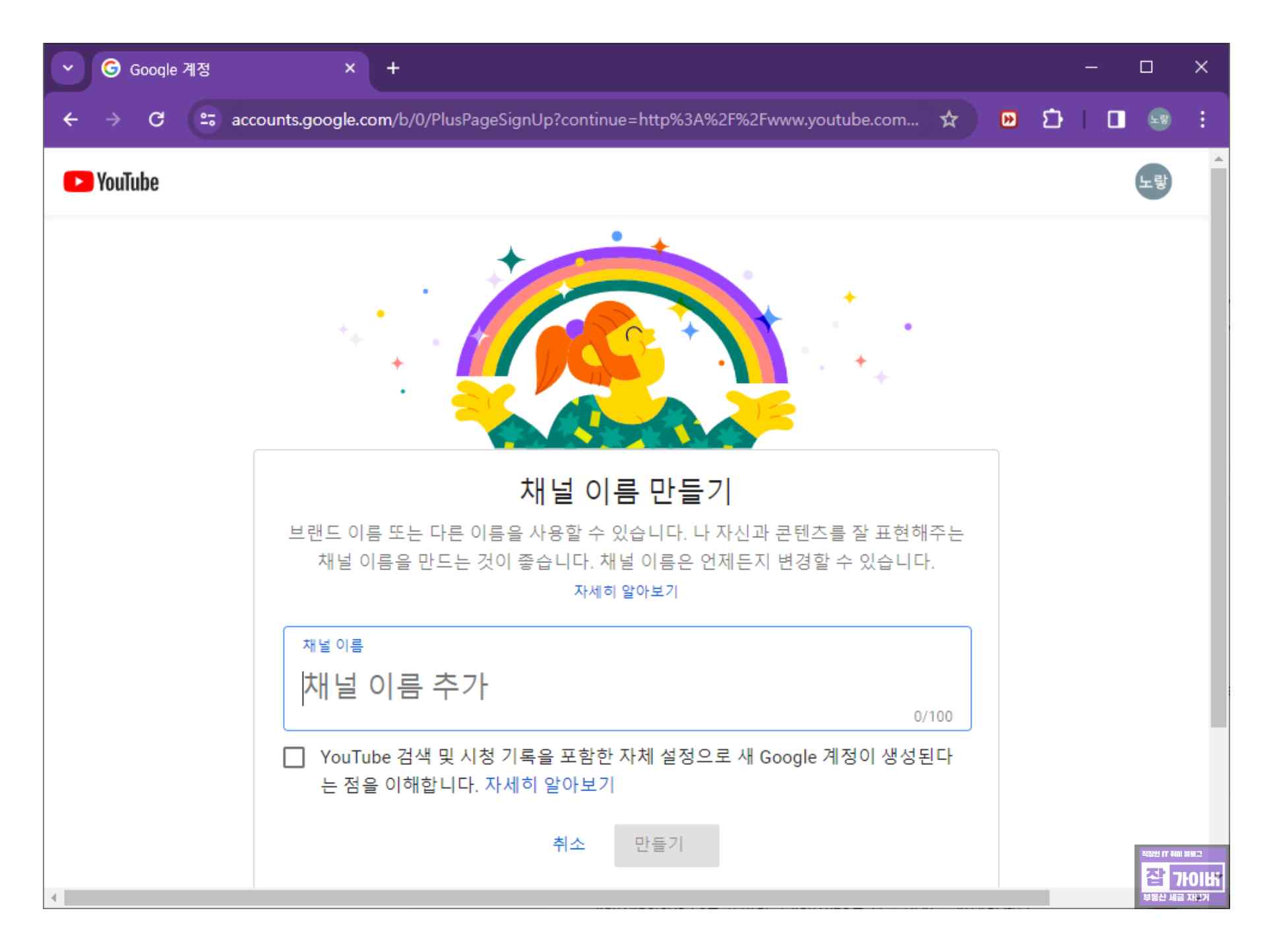원하는 유튜브 채널이름을 지어줍니다. 이 때 지정한 채널이름은 추후 설정에서도 변경할 수 있기 때문에 부담없이 채널이름을 설정합니다.