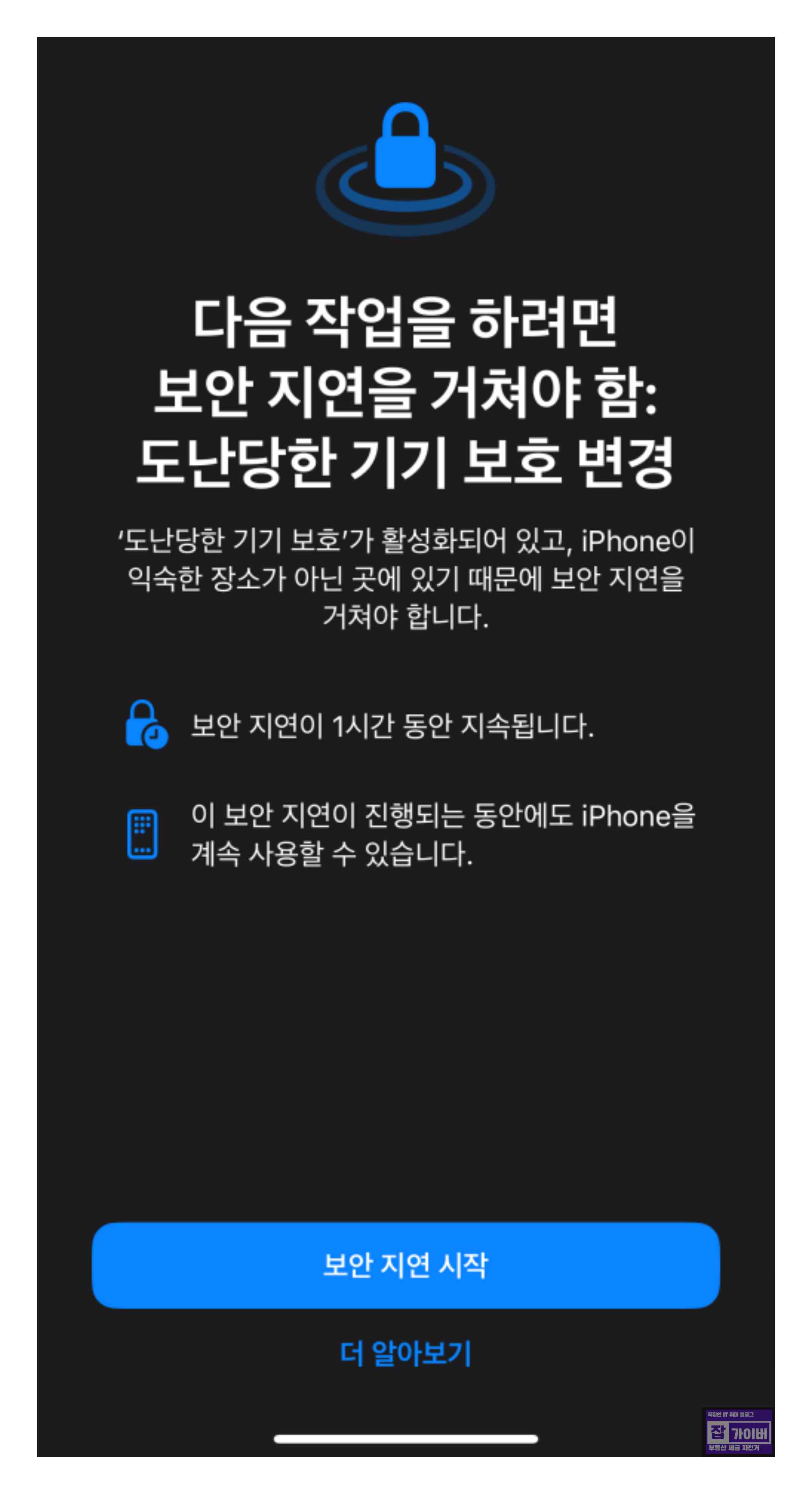 또한, '도난당한 기기 보호'를 해제할 때는 1시간의 지연이 있으며 등록된 장소가 아닌 낯선 곳에서 기능을 해제할 때 적용됩니다. 등록된 장소에서는 지연 없이 기능을 해제할 수 있습니다.