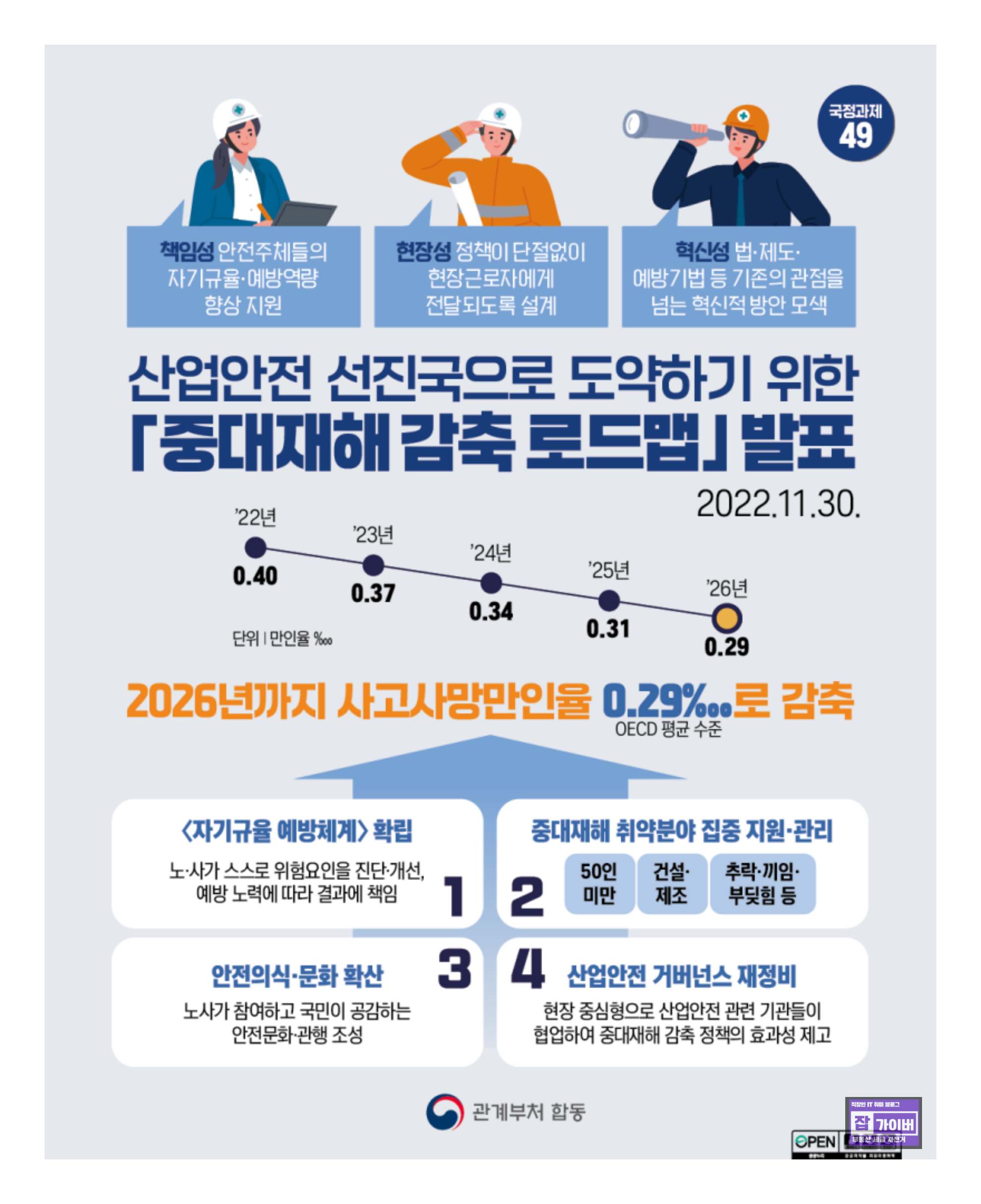 현제 위험성평가 고시를 개정하여 간소화한 방법, 노무사 및 재해예방기관을 통한 컨설팅 지원, 여러 유관기관을 통해 중대재해처벌법의 이해 및 사업주 의무사항 교육 등 여러 지원을 하고 있지만, 50인 미만 사업장의 범위가 워낙 넓고 많기 때문에 한계가 있습니다.