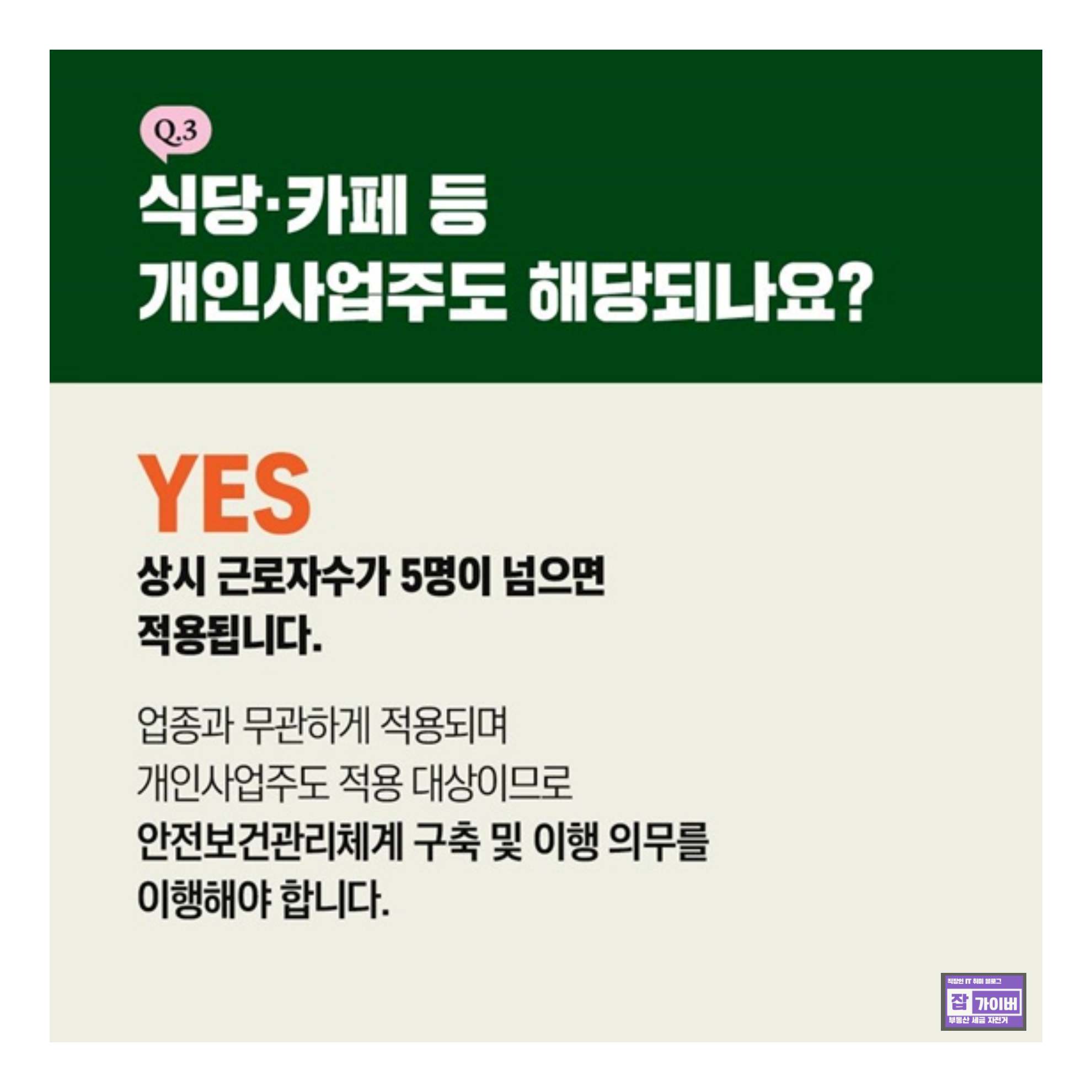 특히, 5~10명을 고용하여 운영하는 고깃집, 까페와 같은 외식업의 경우 해당 법 적용은 '건설업', '제조업'에만 국한되어 적용되는 것이 아니냐는 질문을 하실 정도로 중대재해처벌법에 대한 인식도 낮고 준비도 이루어지지 않고 있습니다.