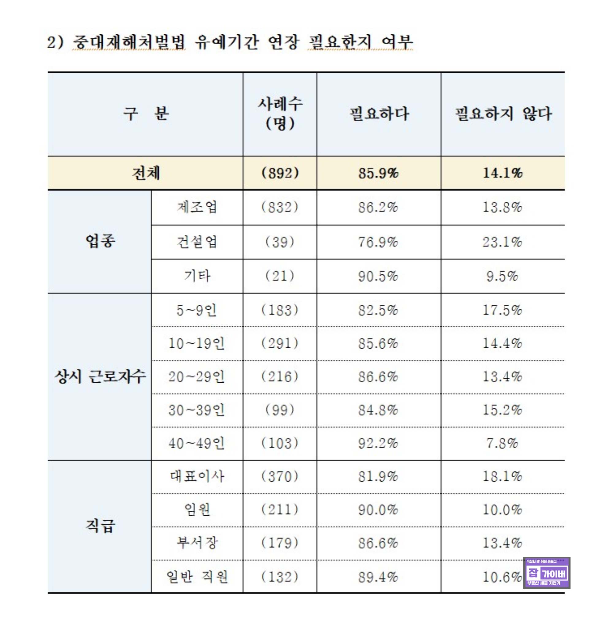 이에 50인 미만 사업장에 대한 적용을 24년보다 더욱 유예하여 준비기간을 주자는 의견이 많습니다. 아래 통계자료를 보시면 유예가 필요하다는 의견이 80%~90%에 육박할 정도로 압도적임을 알 수 있습니다.