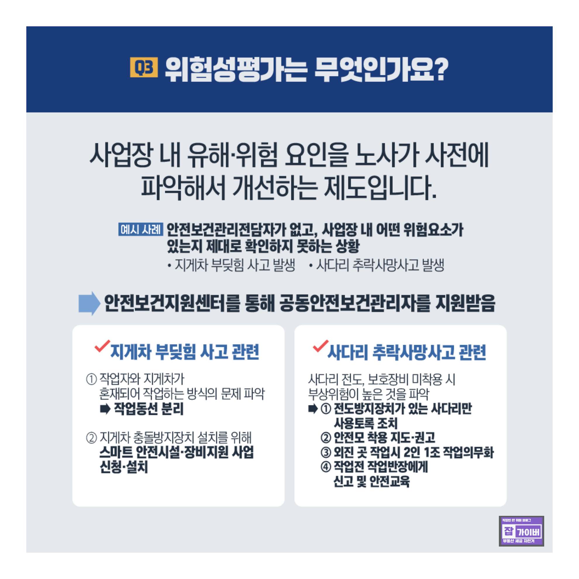 실무상 어려움을 완화하기 위해 간소화 절차를 통해 위험성평가 방법을 개정하는 등 고용노동부의 여러 노력은 있었지만 아직도 어려운 것은 현실입니다.