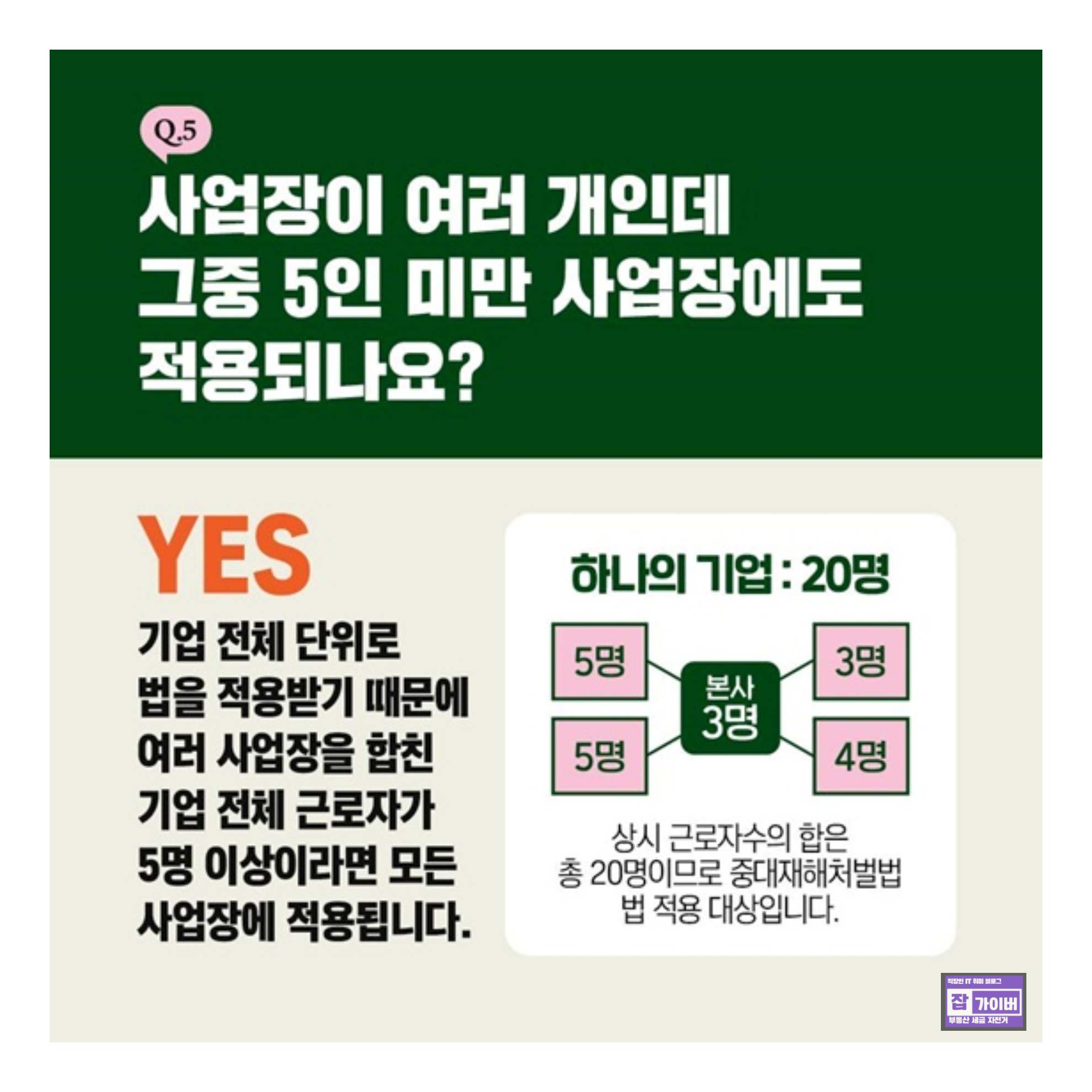 기업 전체 단위로 법을 적용받기 때문에 여러 사업장을 합친 기업 전체 근로자가 5명 이상이라면 모든 사업장에 적용됩니다.