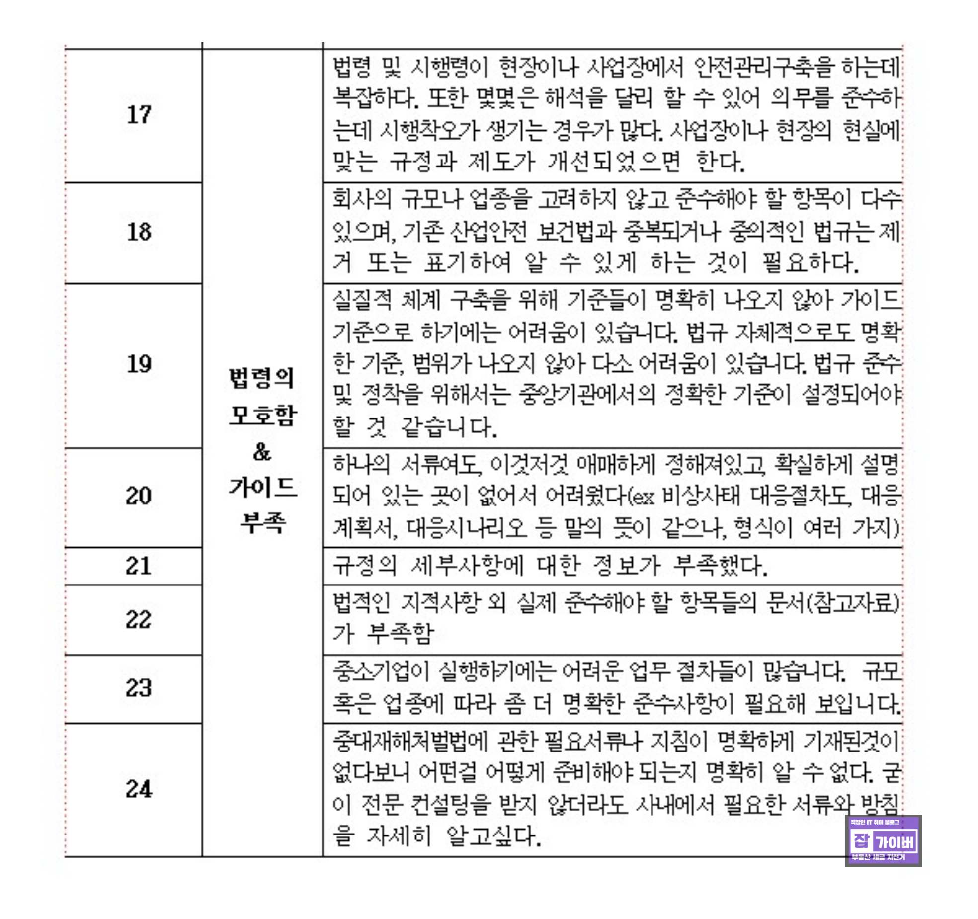 눈에 띄는 것은 중처법상 사업주의 의무를 이해하기 어렵다는 부분이며, 중처법을 보았을 때 비전문가(변호사 또는 노무사, 재해예방기간, 안전전문가 등)가 쉽게 서류를 준비하고 정기적으로 점검하기에는 어려운 부분이 많습니다.