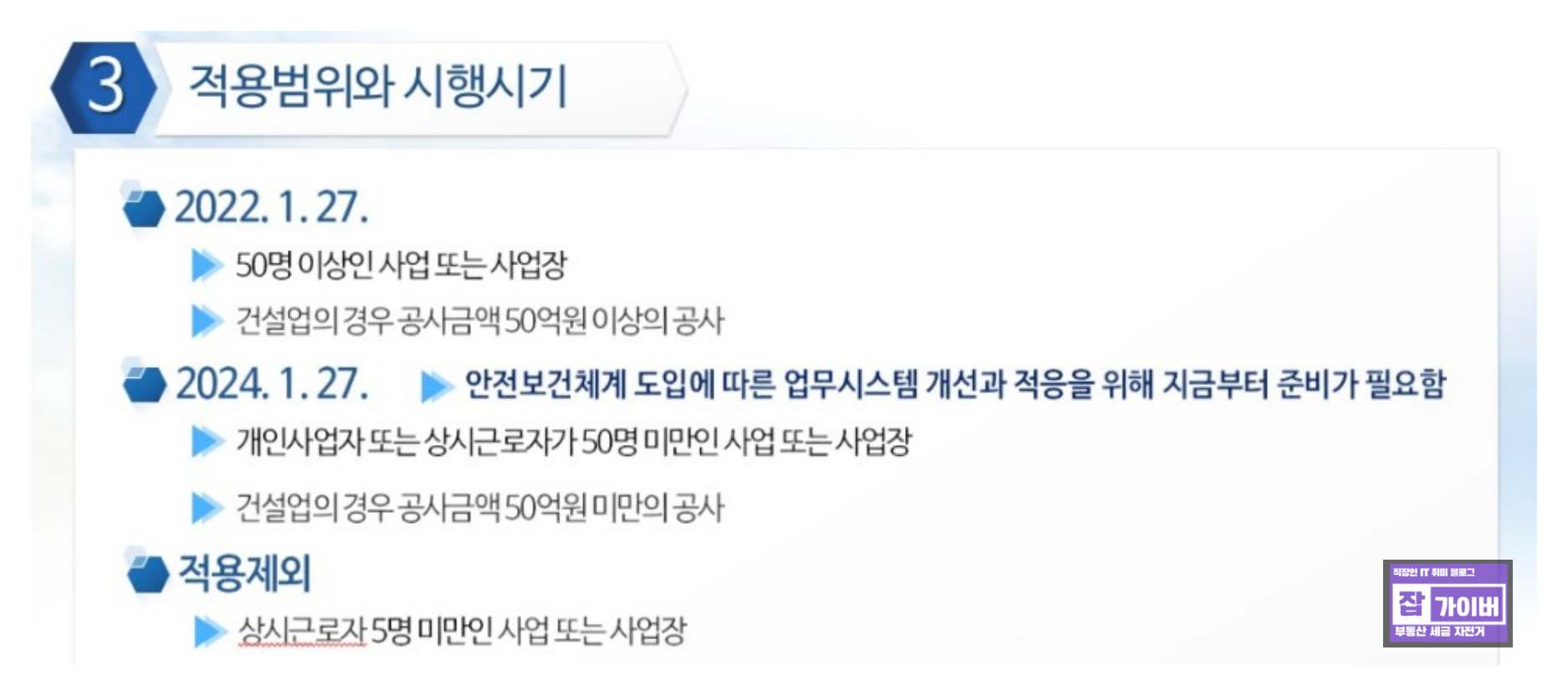 이 법안은 기업의 안전보건조치를 강화하고 안전투자를 확대하여 근로자의 생명과 신체를 보호하는 것을 목적으로 합니다. 2022년 1월 27일부터 상시근로자 50인 이상 사업장에 우선 적용했고 이후 2년 유예를 거쳐 2024년 1월 27일부터 50인 미만 사업장에 확대 적용할 예정이었습니다.