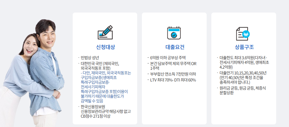여기서 신혼부부는 대출 신청일 기준 혼인신고일이 7년 이내인 가구를 의미하고, 예비 신혼부부도 관련 서류만 갖추면 포함될 수 있습니다.