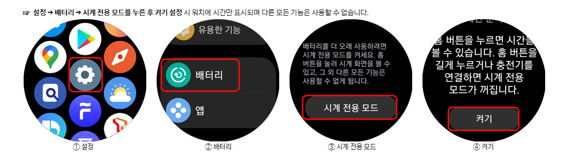 설정 방법은 어렵지 않다. 워치 화면 상단에서 아래로 스와이프해서 빠른 설정창을 열고, 톱니바퀴 모양 설정으로 들어간 뒤 배터리 및 디바이스 케어 → 시계 전용 모드 순서로 들어가서 활성화해 주면 된다. 이렇게 설정해 두면 배터리 소모가 눈에 띄게 줄어든다.