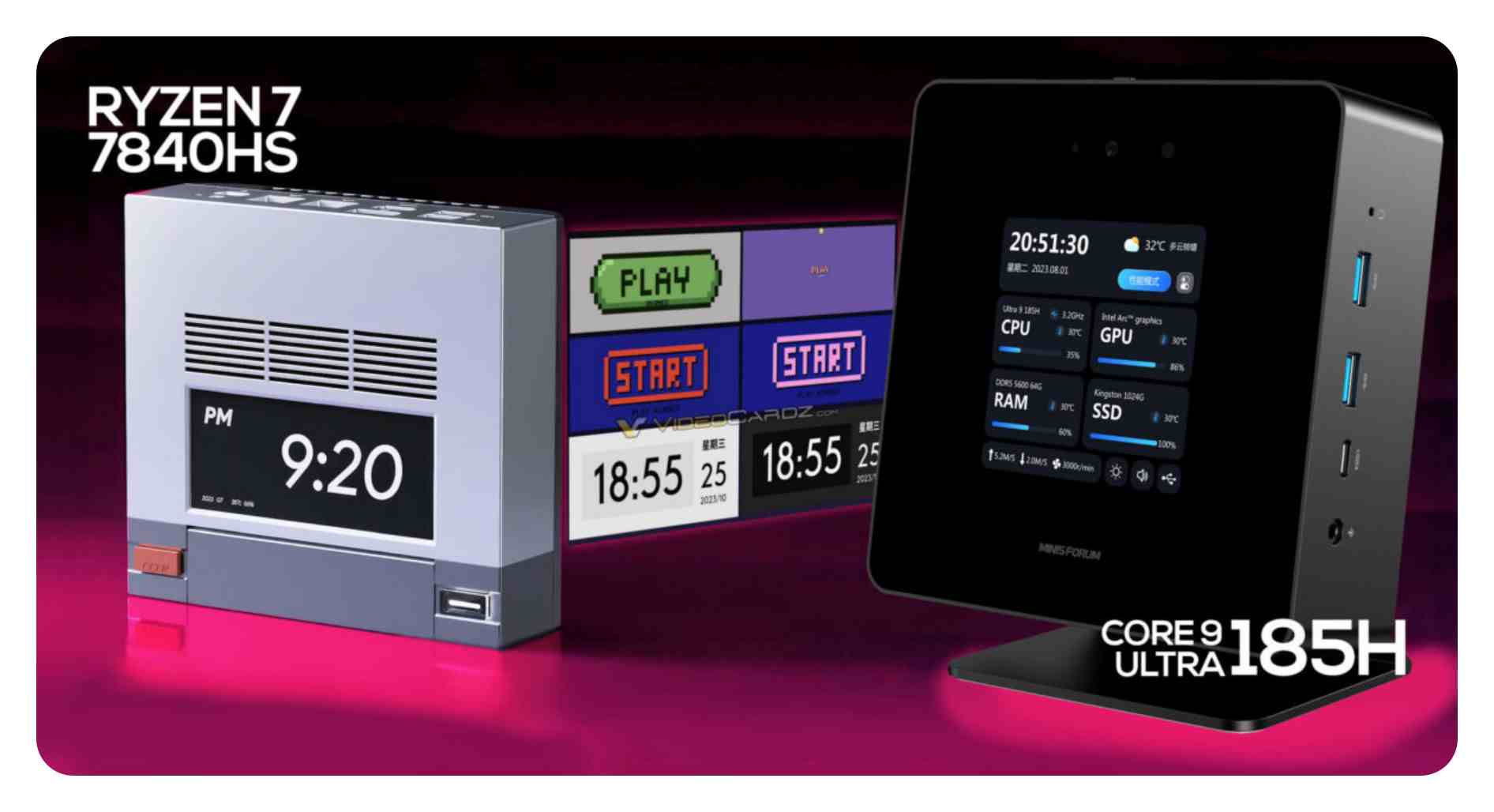 미니 PC의 상단 커버에는 CPU, GPU, RAM, SSD 지표 등 다양한 시스템 파라미터를 표시하는 보조 디스플레이가 있습니다. UH185 울트라는 미니스포럼의 혁신적인 디자인과 기술력을 과시하며, 2024년 미니 PC 시장에서 새로운 기준을 세우기 위해 준비되어 있습니다.