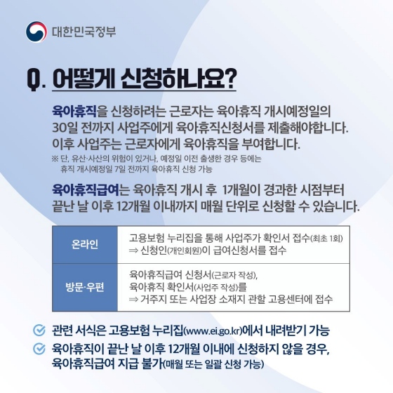 Q2. 육아휴직을 어떻게 신청하나요? 육아휴직을 원하는 근로자는 육아휴직 개시 예정일의 30일 전까지 사업주에게 육아휴직 신청서를 제출해야 합니다. 단, 특별한 사유(유산·사산 위험 등)가 있는 경우에는 휴직 개시 예정일 7일 전까지도 신청 가능합니다. 육아휴직 급여는 육아휴직 개시 후 1개월이 경과한 시점부터 12개월 이내에 매월 단위로 신청할 수 있으며, 온라인이나 방문, 우편을 통해 신청할 수 있습니다.