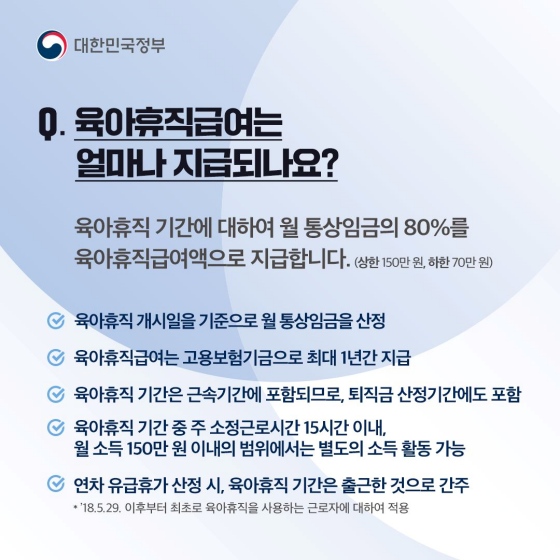 Q5. 육아휴직 급여는 얼마나 지급되나요? 육아휴직 기간에 대해서는 월 통상임금의 80%를 육아휴직 급여액으로 지급합니다. 이때 최저 급여는 월 70만 원이며, 최고 급여는 월 150만 원으로 제한됩니다.