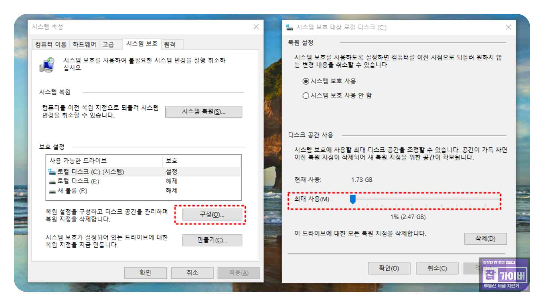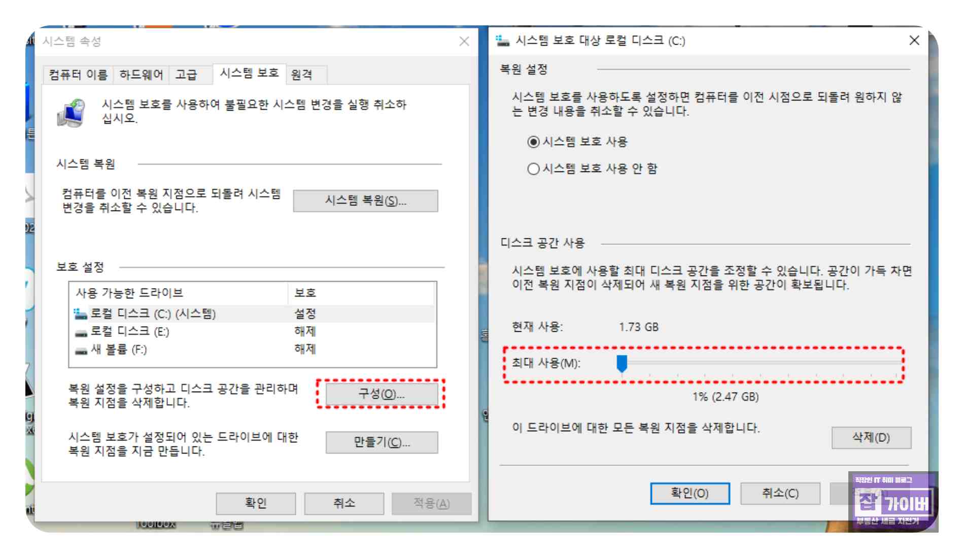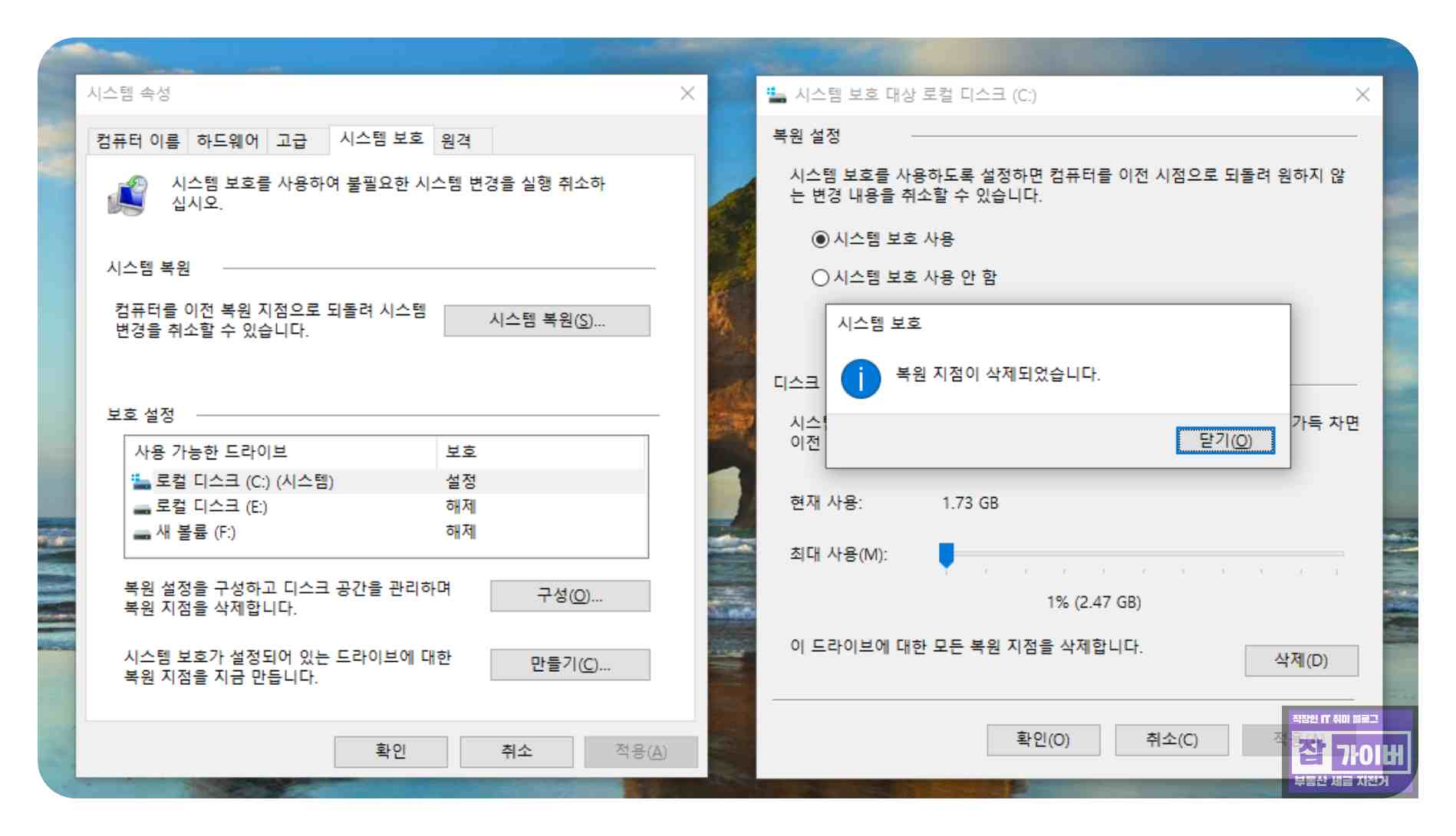 윈도우10 자동백업 복구 복원방법 - 복구지점 삭제