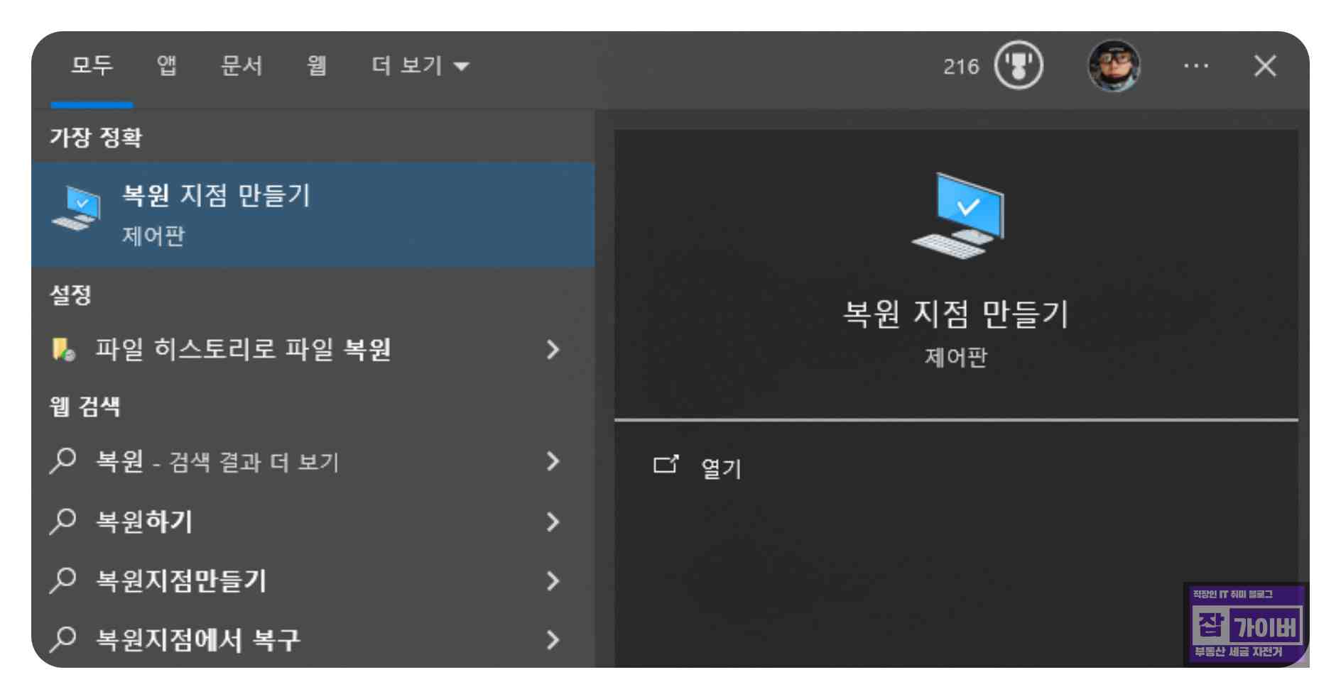 먼저, 윈도우 검색에서 "복원 지점 만들기"를 선택합니다. 시스템 복원 설정에서는 C드라이브에 자동 복구 지점이 설정되어 있고, 최신 복원지점을 통해 언제든지 복구가 가능하도록 설정되어 있습니다.