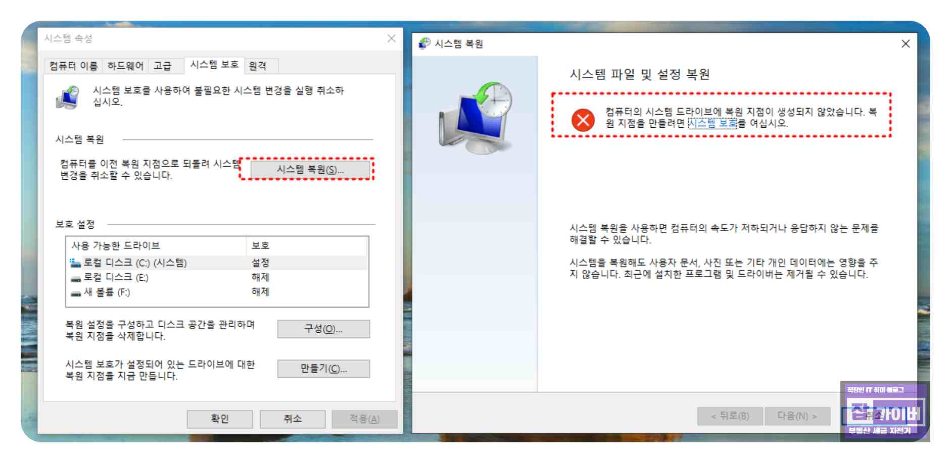 이제 시스템 복원 설정으로 들어가면 윈도우 설정 복원 항목이 비활성화된 것을 확인할 수 있습니다.