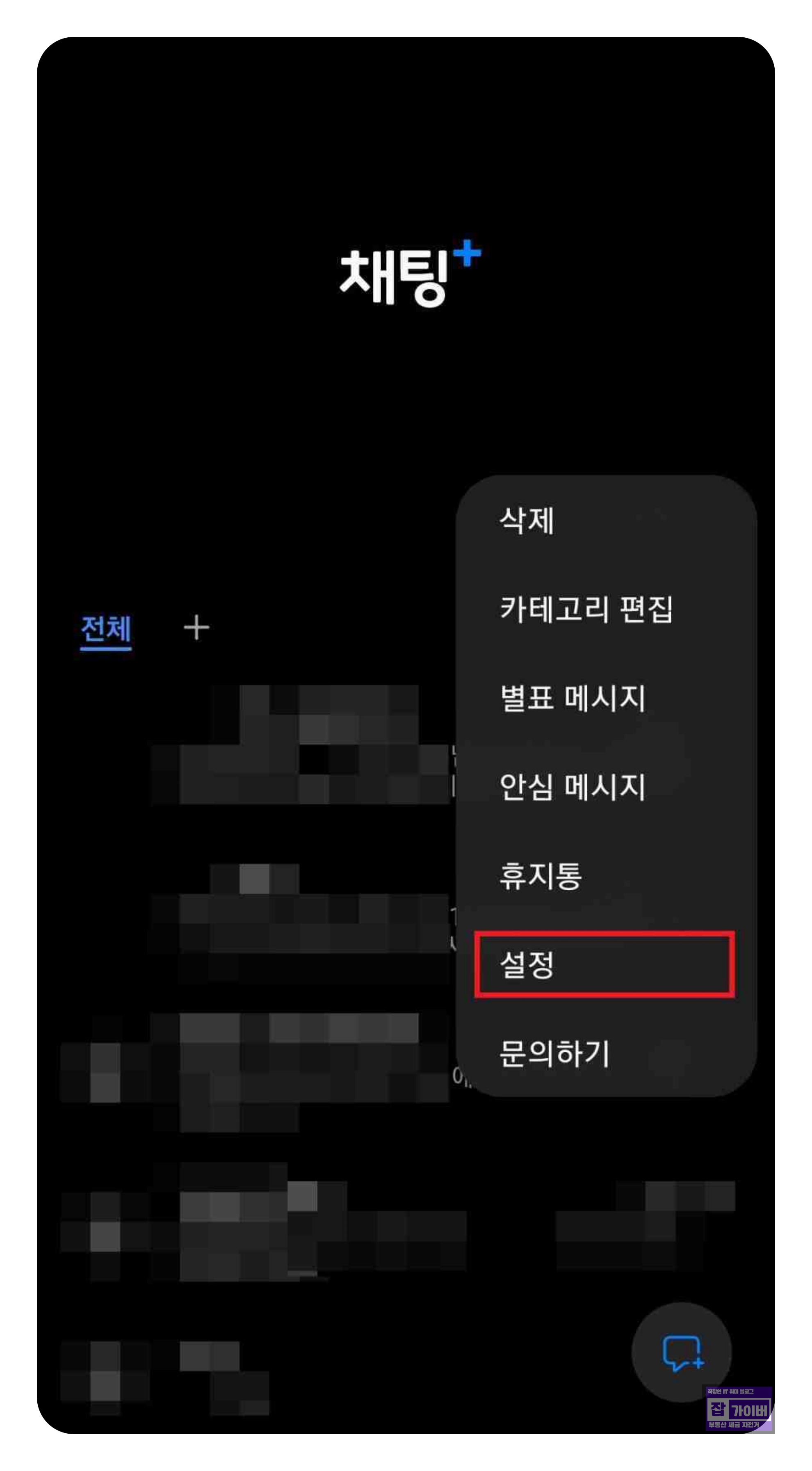 휴대폰 메시지 앱(문자)을 열고 오른쪽 위︙버튼을 클릭하여 설정으로 이동합니다.