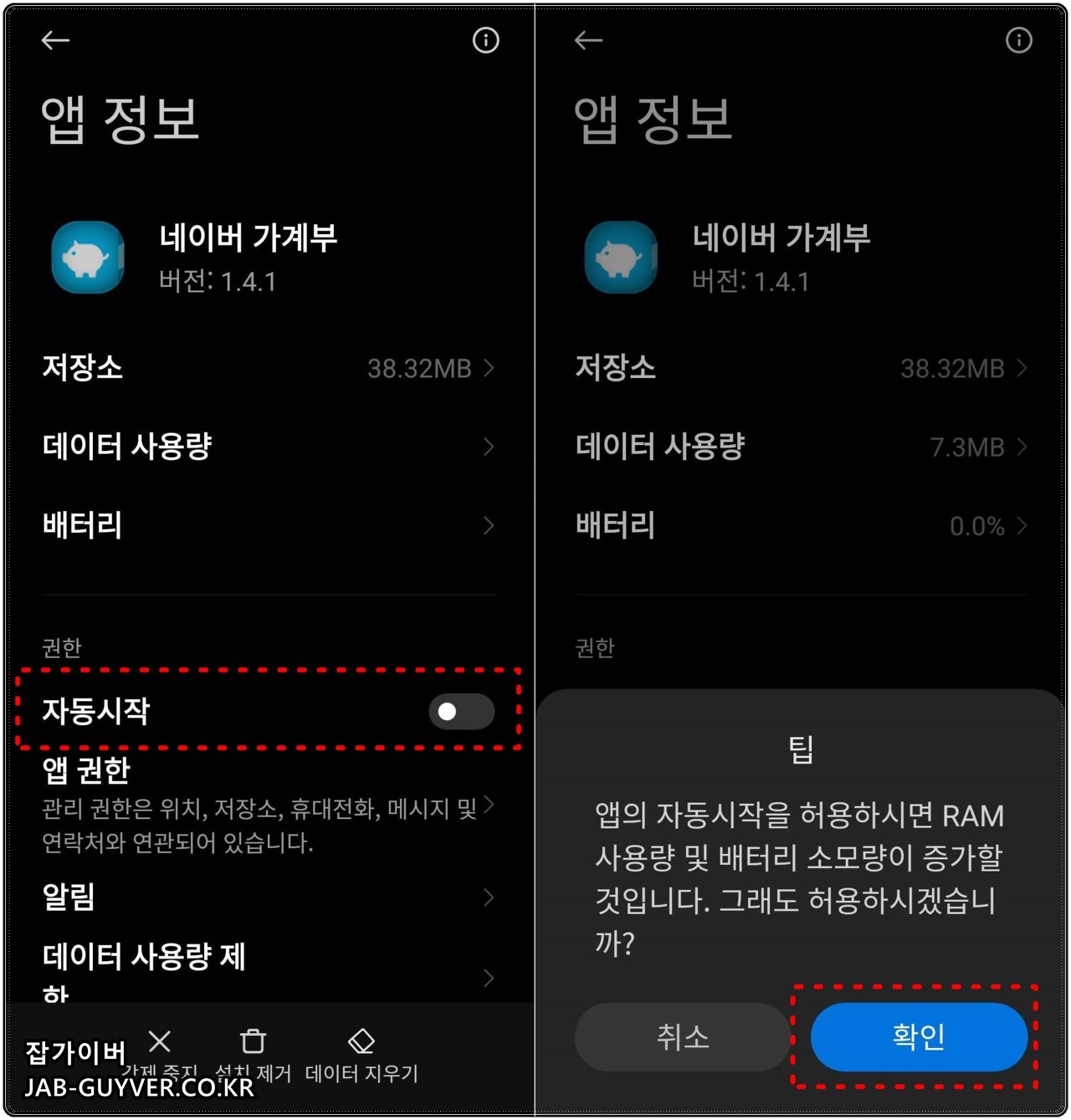그래서 저는 네이버가계부 자동시작을 활성화하고 배터리 절약 또한 비활성화 했더니 이 후부터는 문자메시지를 제대로 인식하기 시작했습니다.