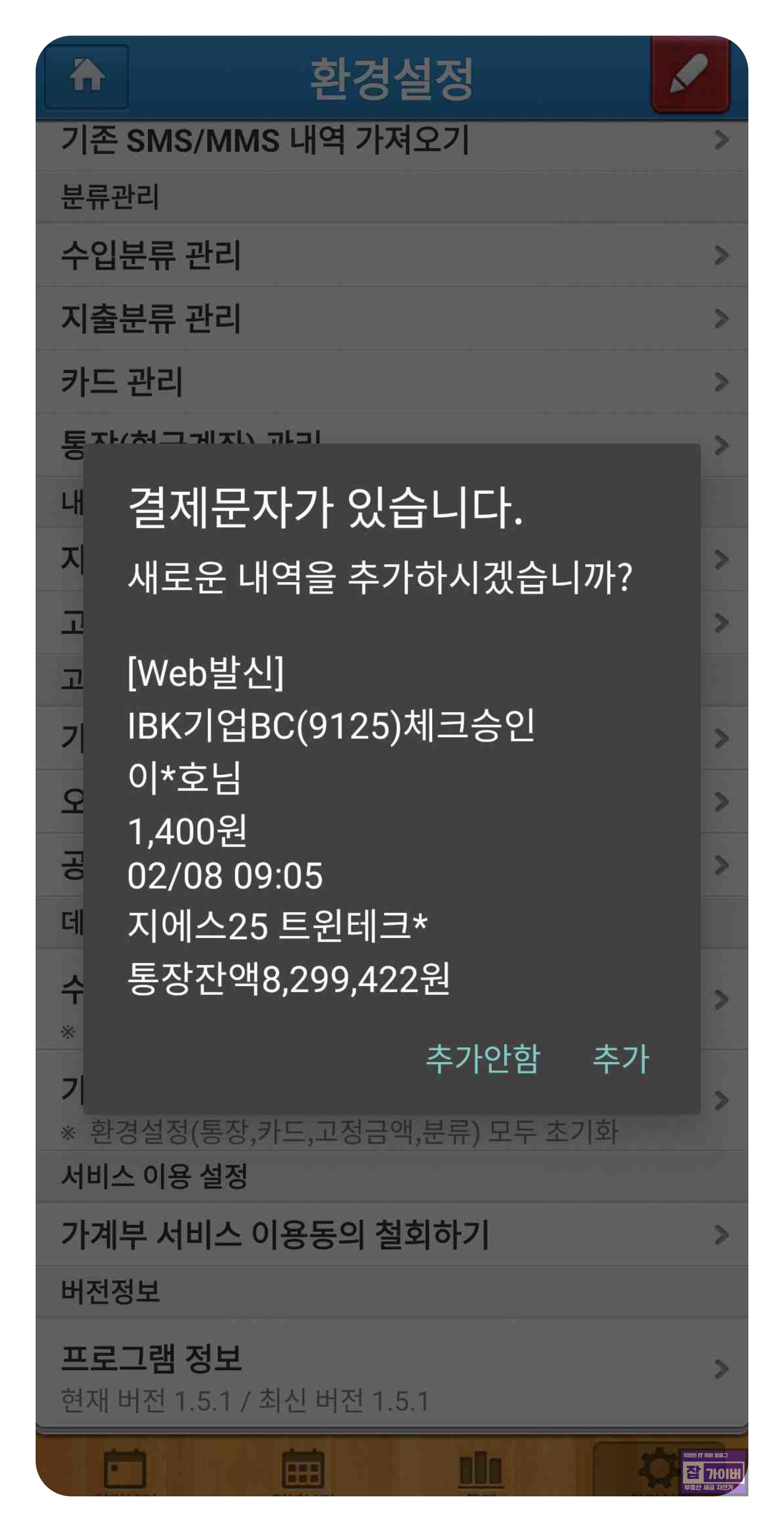 네이버가계부 문자메시지 자동등록 인식오류 해결방법