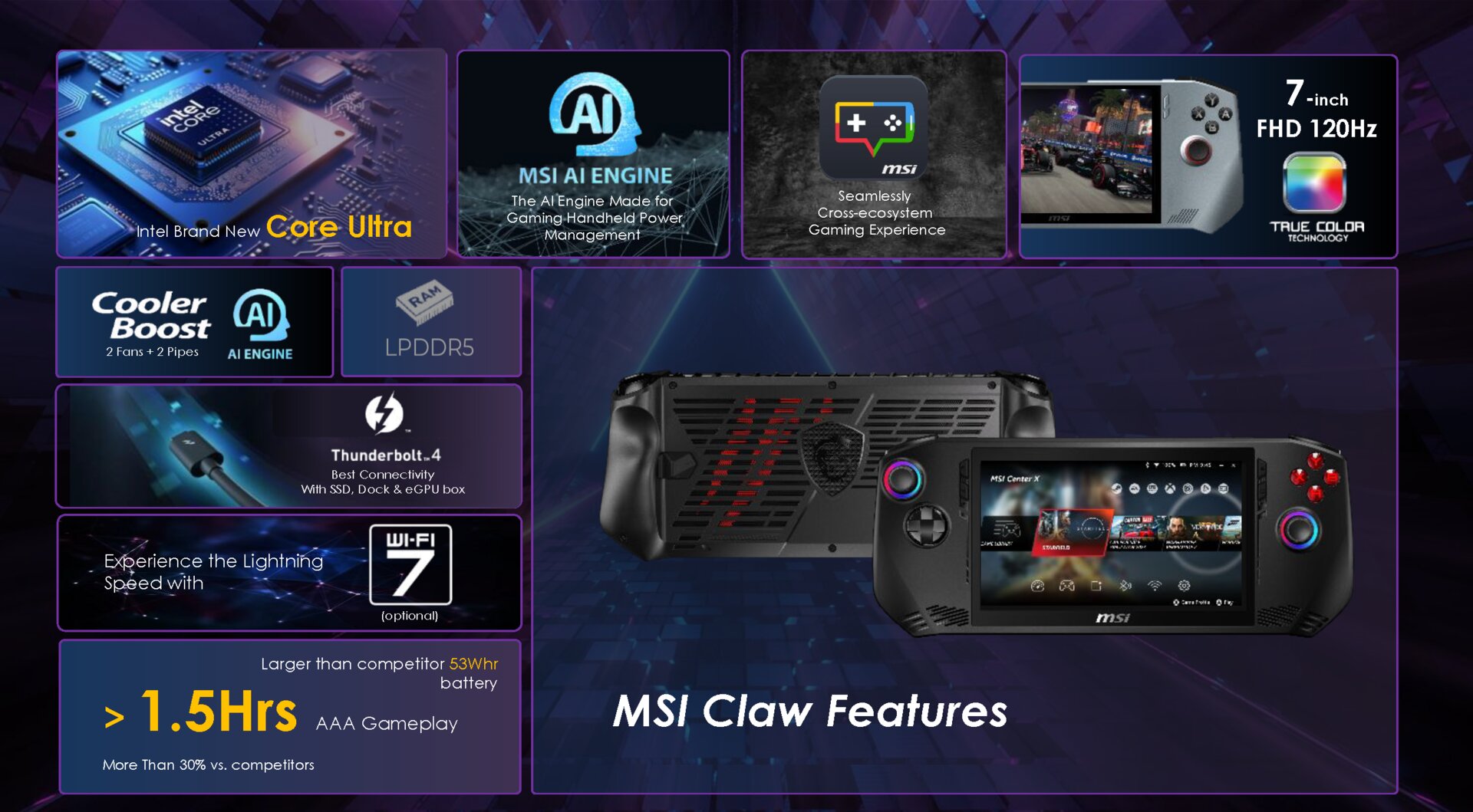 Claw A1M은 MSI의 게임용 핸드헬드 노트북 시리즈 중 하나로, 중급 티어 인텔 Core Ultra 프로세서가 탑재되어 있습니다. 이 기기는 AMD Ryzen Z1 Extreme CPU와 그에 맞는 Radeon 780M iGPU가 내장된 AMD의 최상급 디바이스와 경쟁합니다. 이러한 경쟁 상황에서 인텔은 MSI Claw A1M을 통해 핸드헬드 게임 시장에서의 위치를 확고히 하고자 하였습니다.