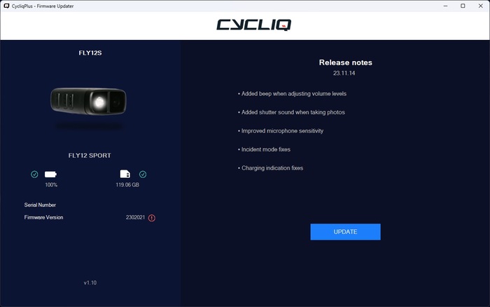FLY12 업데이트는 컴퓨터나 노트북에서 진행할 수 있으며, 블랙박스 본체를 데이터 케이블로 연결한 후 'CycliqPlus'라는 자체 프로그램을 통해 진행할 수 있습니다. 이 프로그램을 사용하면 사용자는 펌웨어 업데이트를 비교적 간편하게 진행할 수 있습니다.