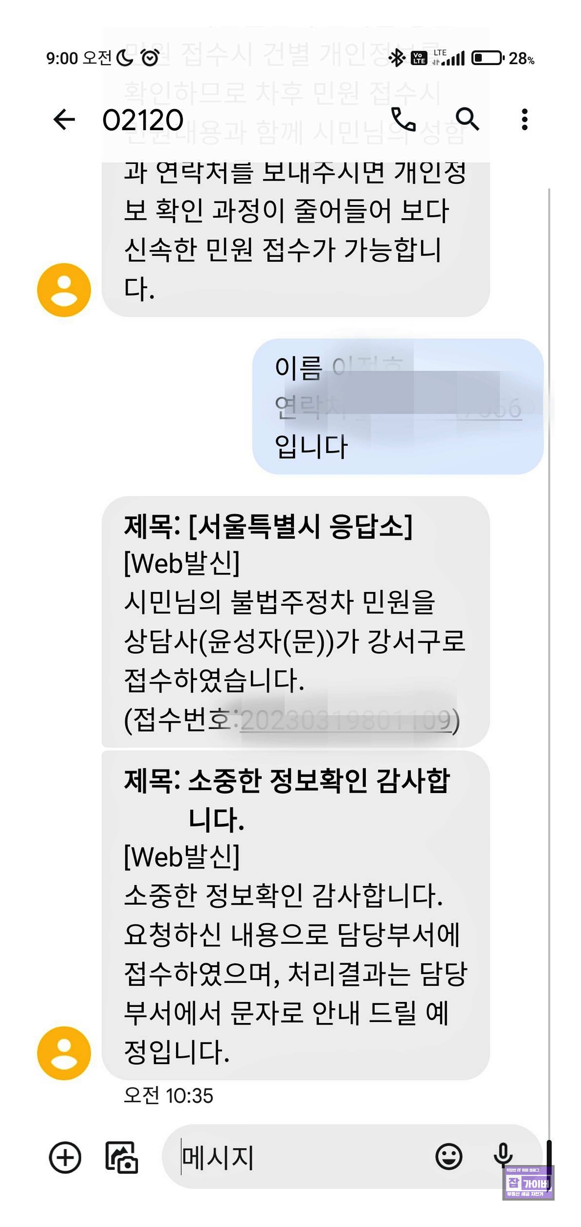 그러면 주차위반 접수가 완료되며, 이름과 연락처를 회신받을 수 있습니다. 다산 콜센터에서는 회신된 접수번호와 연락처 등을 문자 메시지로 받을 수 있으며, 주차위반 내용은 서울 강서구청의 불법주정차위반 팀으로 전달됩니다.