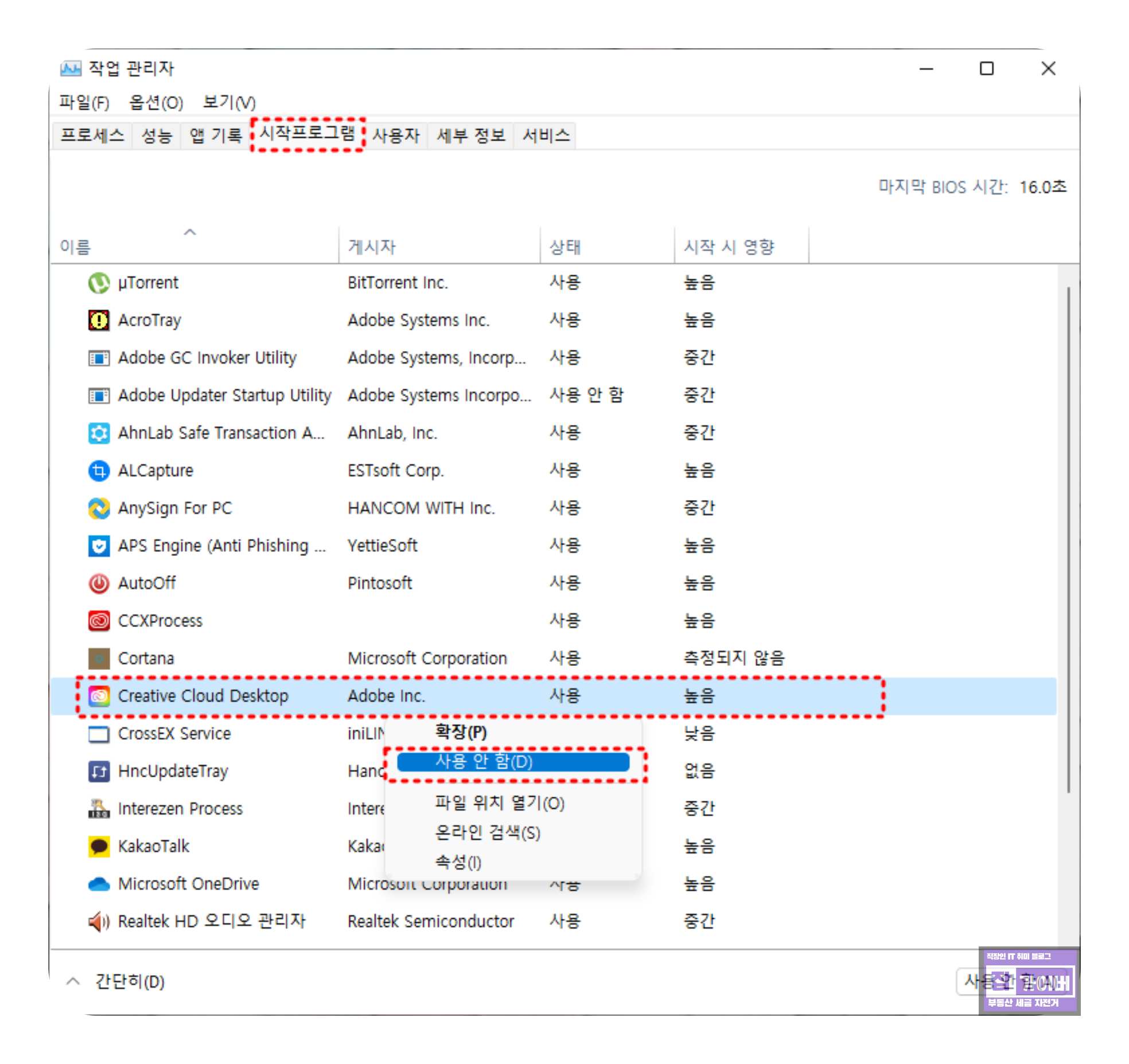 다음으로 상단 탭 중 '시작프로그램'을 선택하고, 'Adobe GC Invoker Utility'를 클릭하여 '사용 안 함'을 선택해 시작프로그램을 중지해야 합니다.