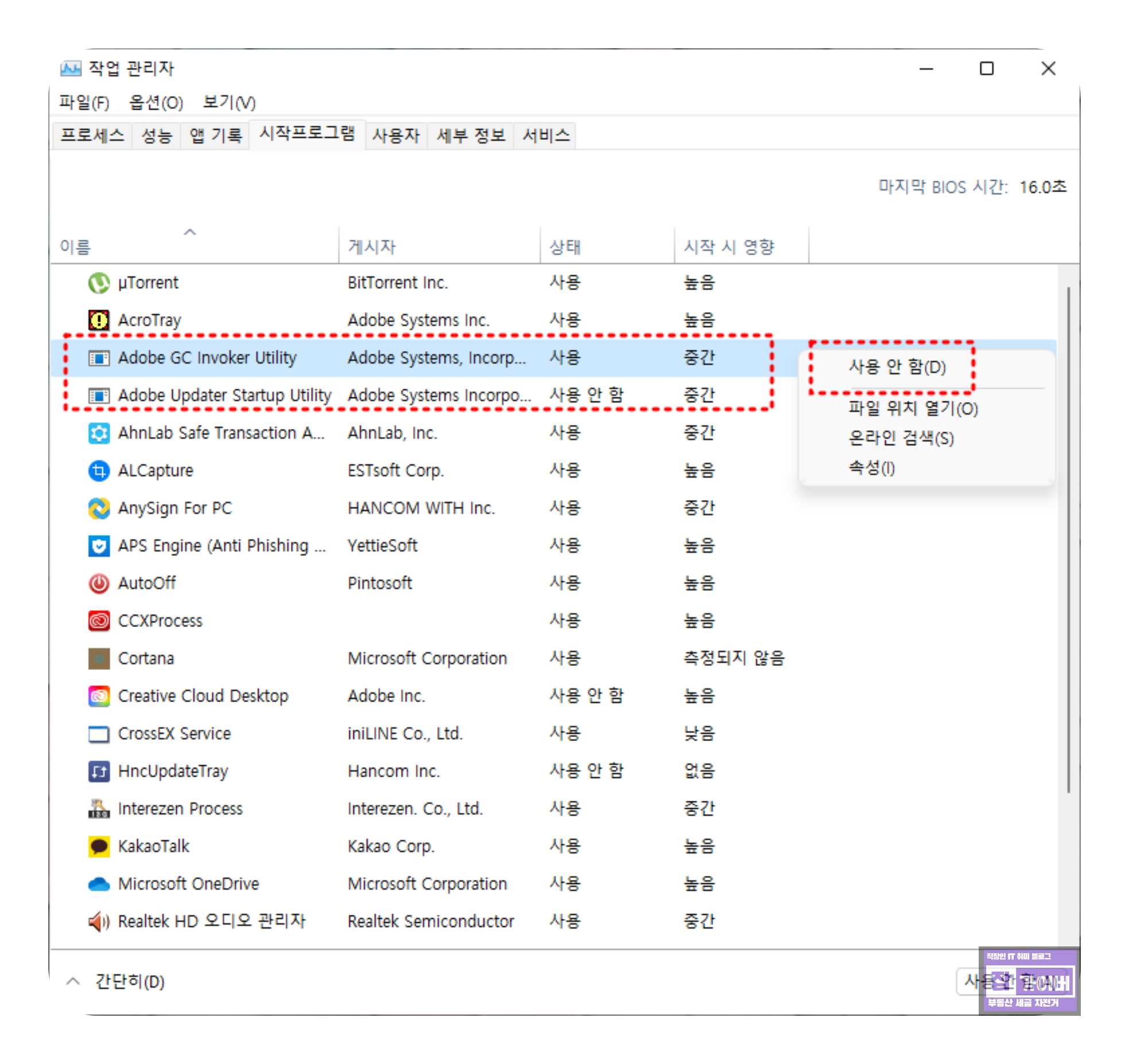 이후 작업 관리자 상단의 시작프로그램 탭에서 Adobe GC Invoker Utility 같은 항목을 찾아 사용 안 함으로 바꾸면, 부팅할 때마다 함께 뜨는 일부 자동 실행 요소를 줄일 수 있습니다. 다만 이 과정 역시 팝업을 줄이기 위한 수준으로만 생각하고, 근본적으로는 정품 라이선스 정리와 계정 관리에 무게를 두는 편이 좋습니다.