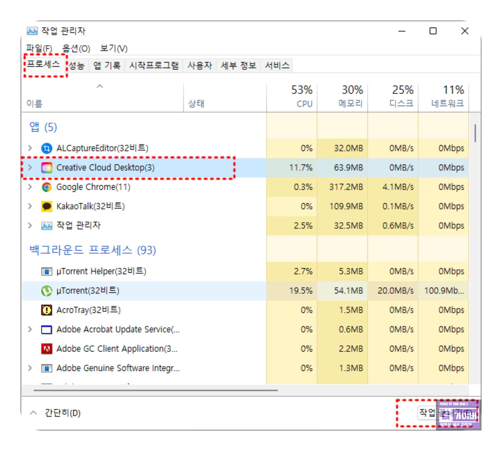윈도우 작업 관리자를 열면 Adobe genuine software integrity service(32비트), Adobe genuine software Monitor service(32비트) 같은 항목이 백그라운드 프로세스로 떠 있는 것을 볼 수 있습니다.